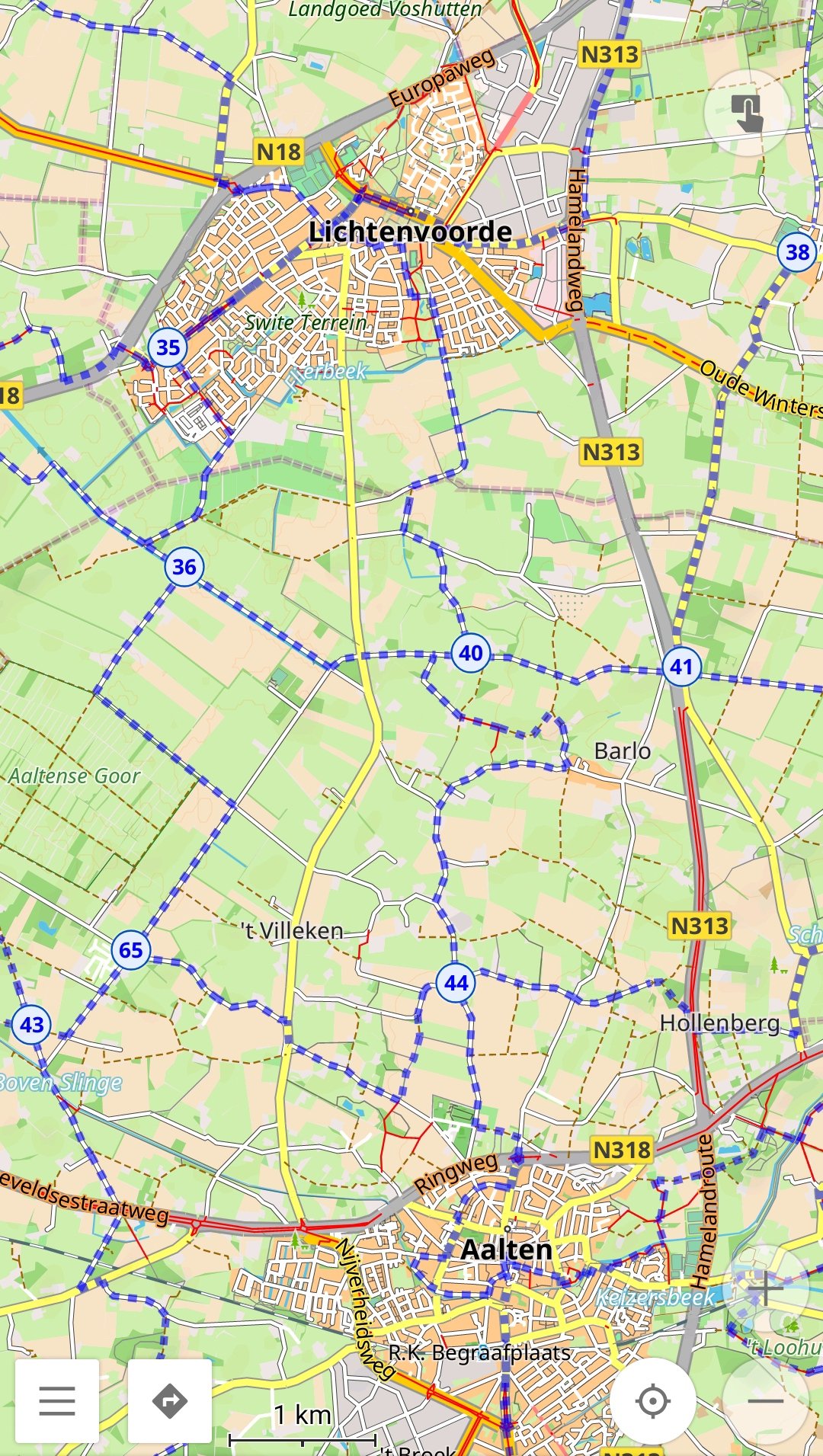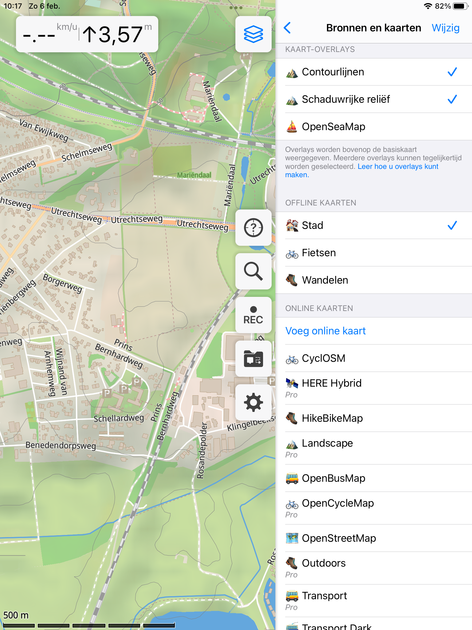 Zo fiets ik altijd op de offline-kaarten van Galileo Guru, stad of fietsen, maar wil tijdens een rust nog wel eens op OpenCycleMaps kijken. Voor fietsen en het volgen van een kruimelspoor vind ik OpenCycleMaps te onrustig.