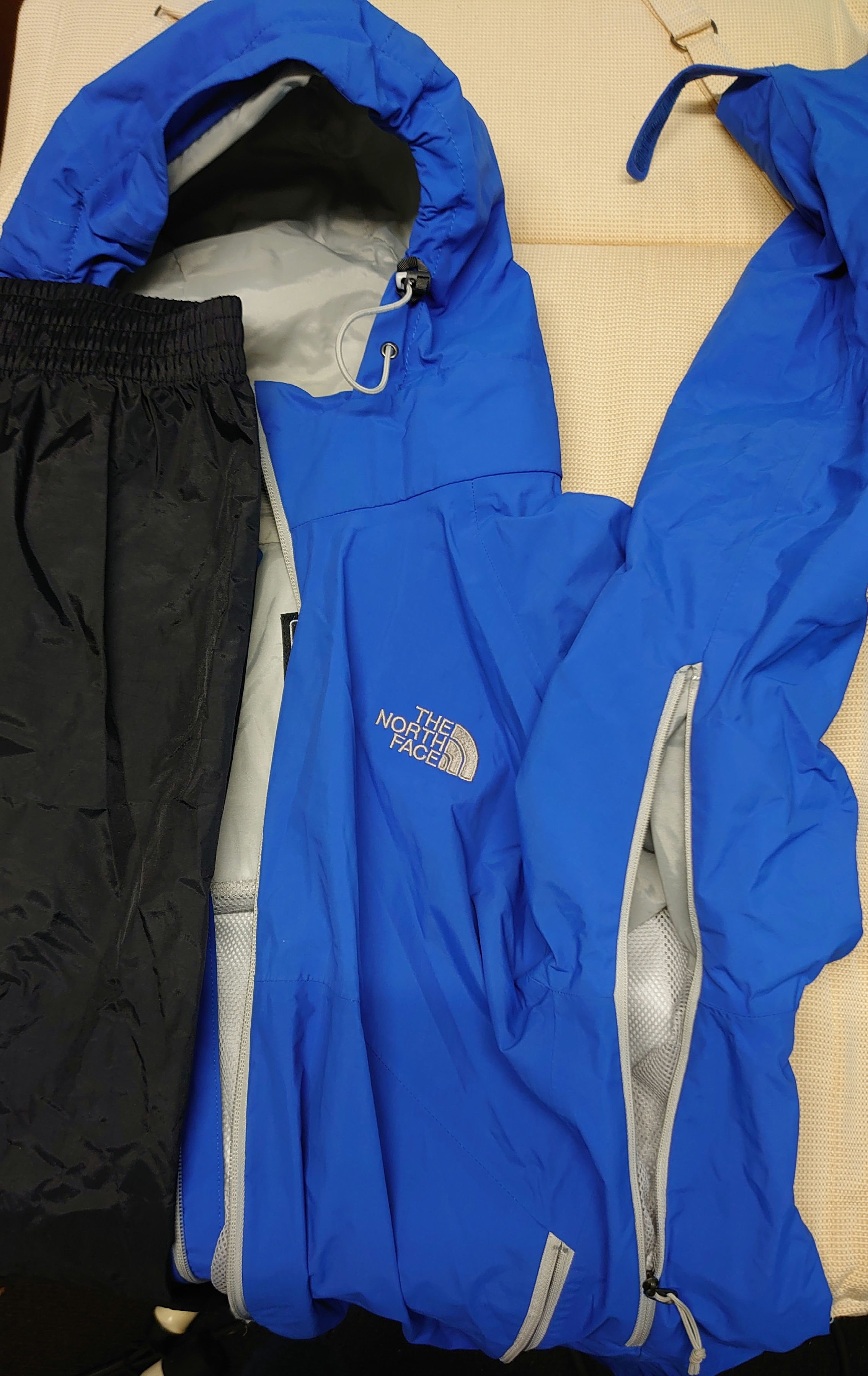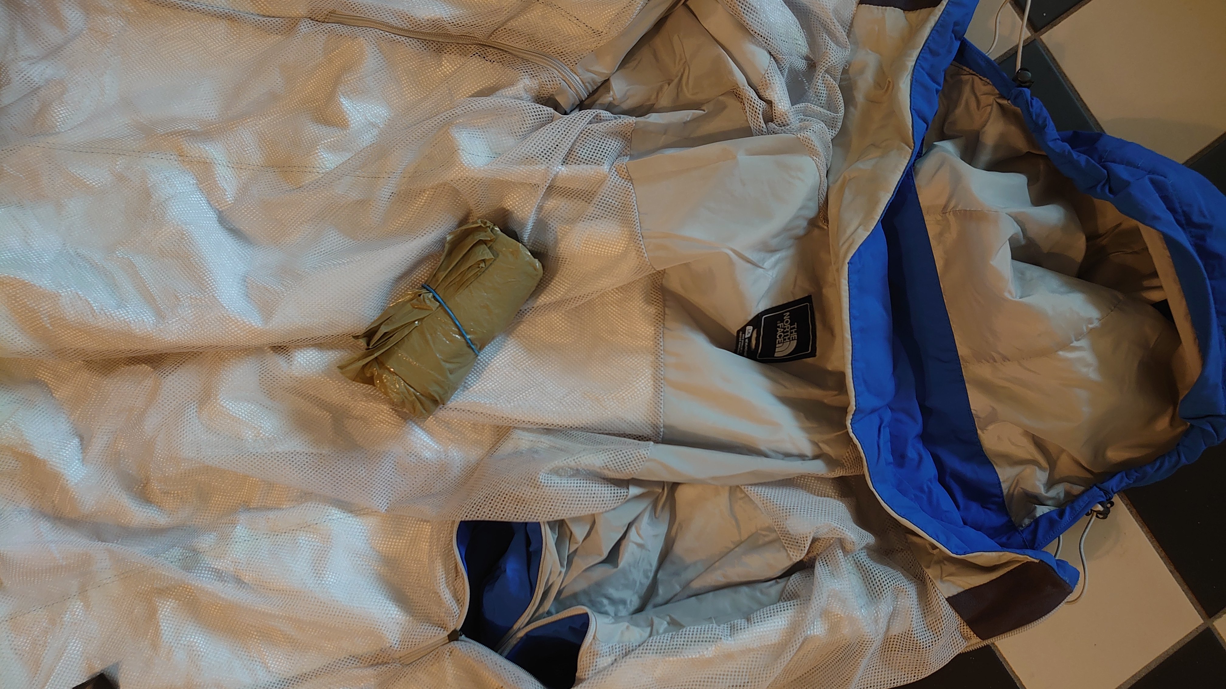 O ja, de genoemde poncho, zo'n plastic vuilniszakgevalletje en daarnaast een North Face waterdichte regenjas met ritsen onder de oksels.
