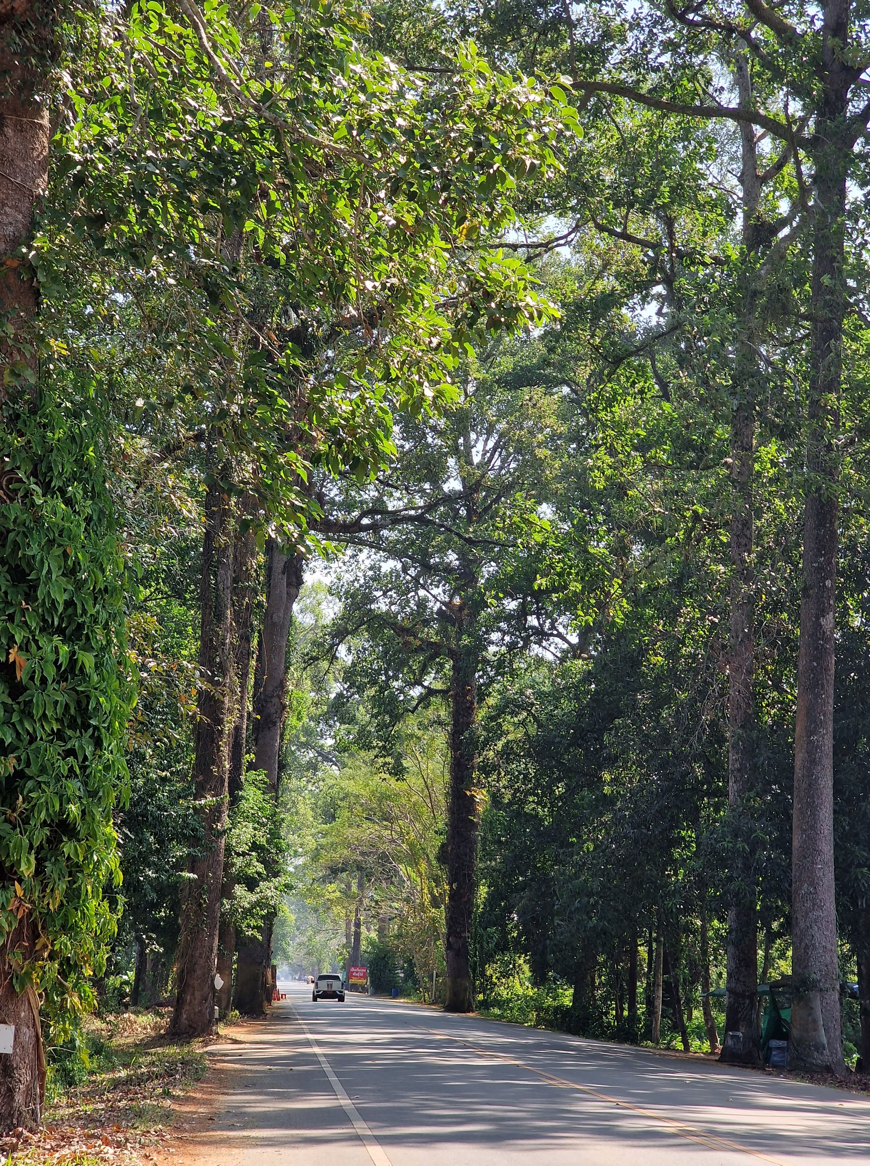 De tuin bestaat uit een aantal moeraseilanden die verbonden zijn met houten brugjes. Het landschap is niet uitzonderlijk spectaculair, maar het is heel aangenaam vertoeven in dit stukje natuur. Het is een mooi rustpunt tussen het Thaise verkeer van de vorige dagen. De brugjes zijn ook een dingetje: nog geen meter breed, geen borstwering en enkele 10-tallen meters lang. Op zich geen punt om er met beladen fiets over te rijden, maar ik behoed me opzij te kijken want ik wil het ondiepe water niet inrijden. Op het tweede brugje neemt een fotograaf huwelijksfoto’s van een mooi uitgedost jong stel. Met wat onhandig gesukkel en een verontschuldigend lachje wring ik me voorbij het koppeltje. Het laatste eiland laat ik voor wat het is want het pad ernaartoe staat onder water en ik kan niet inschatten hoe diep het precies is en hoe dik de onderliggende slijklaag is. Safety first – en het is ook nog wat vroeg om mijn 5-dagen oude fiets erdoor heen te jagen.