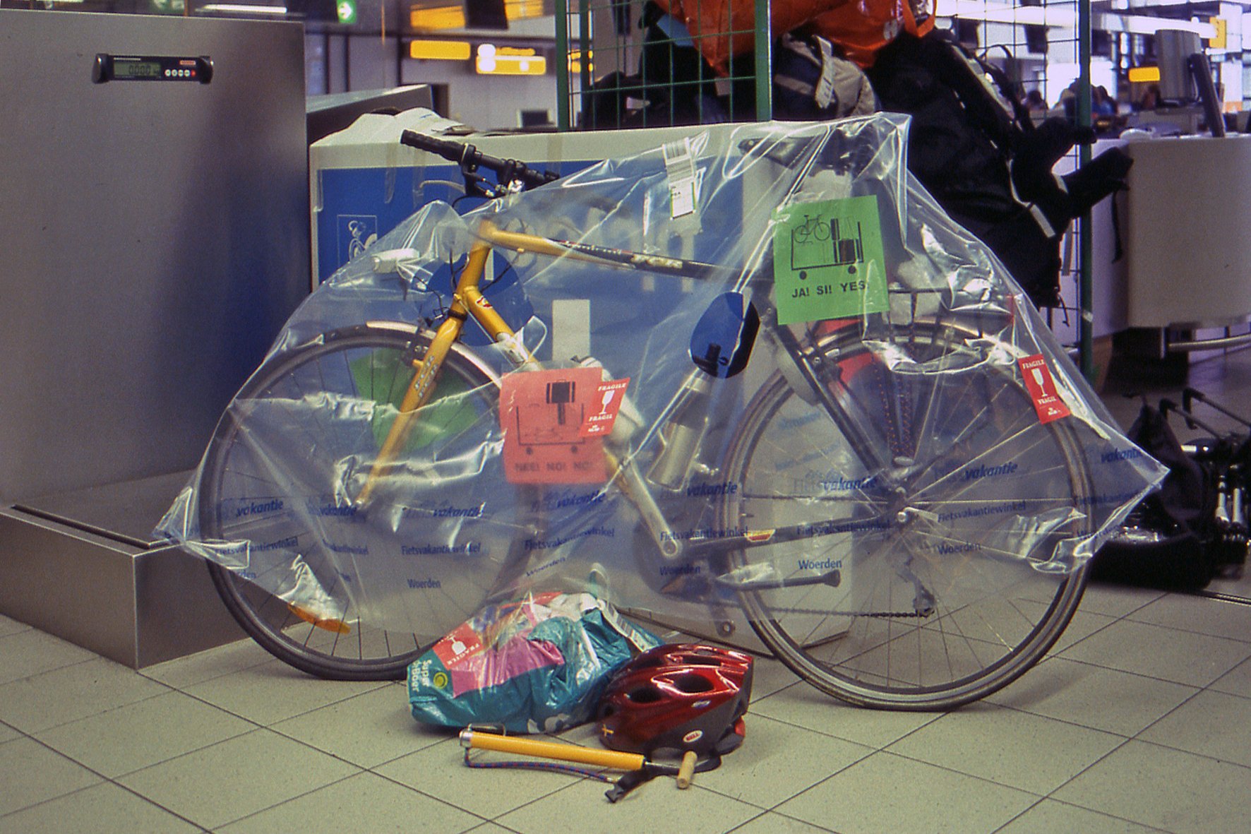Dat gewicht is wel weer een dingetje: de fiets zelf mag bij de KLM maar 18,5 kilo wegen; da's niet veel.