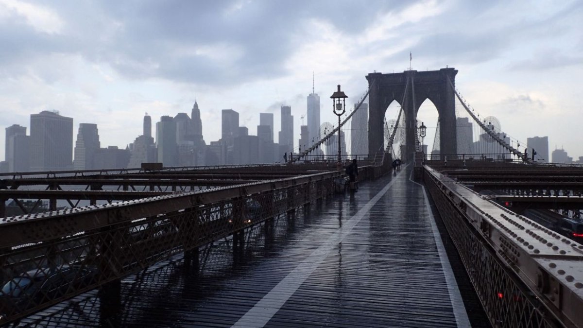 Een overbekende brug, maar wel anders dan je hem meestal ziet. Dit was vorig jaar augustus net na een flinke stortbui. Wij waren onderweg naar de ferry naar Sandy Hook, die niet ver van de brug vertrekt. (en ja, onze tandem met aanhanger mocht mee