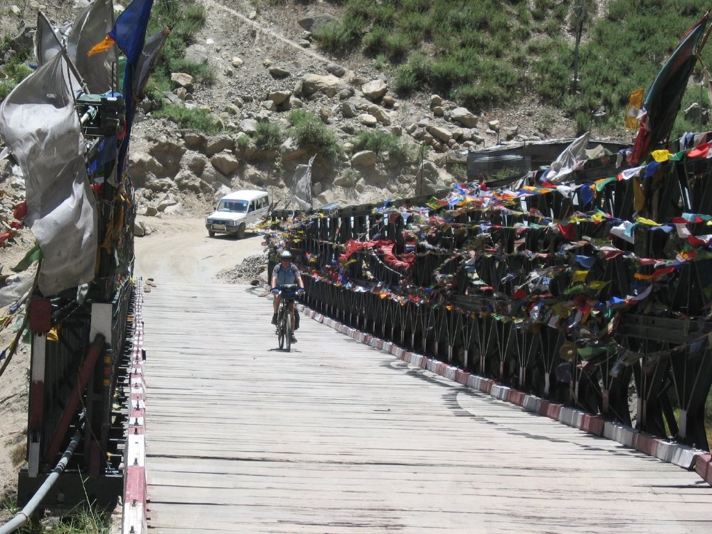 Deze brug maar één keer. In de buurt van Sangla Noord-India.