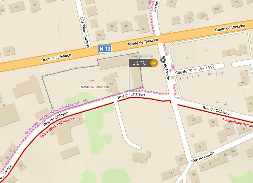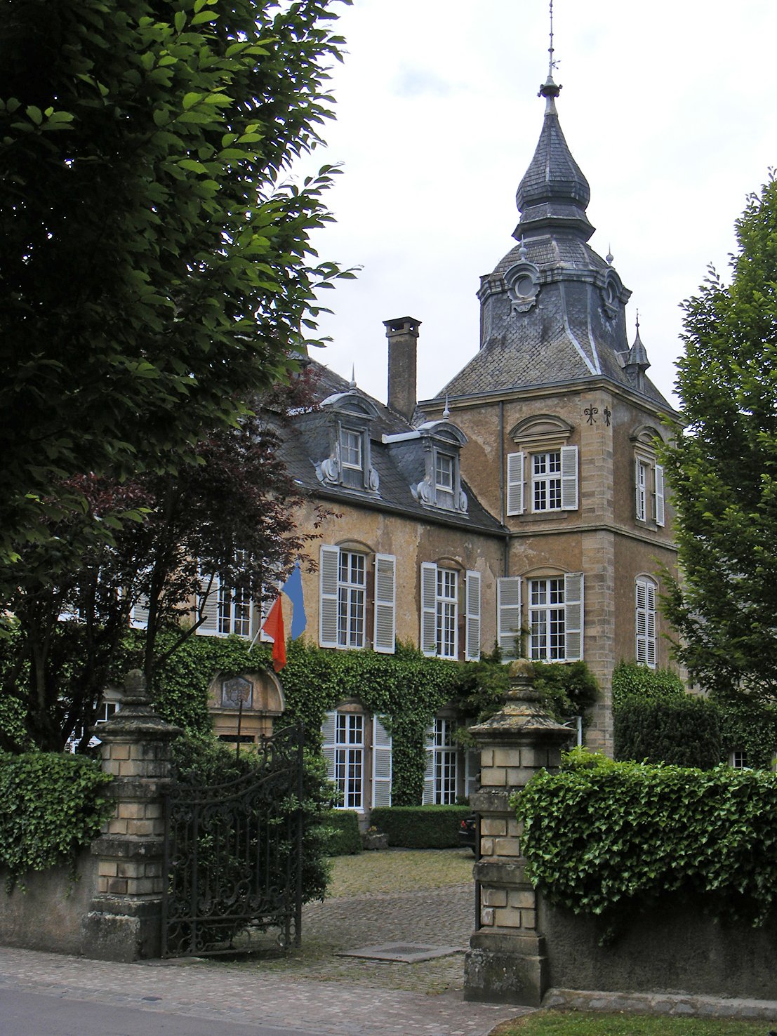Inderdaad Château Bettendorf in Luxemburg. Foto is van 2013. De geblurde vlag is van Luxemburg, de zogenaamde "roude lièw" op blauw-witte strepen. Mooie fietstocht aldaar maar de wegen worden me al te druk, zeker tijdens spitsuren.