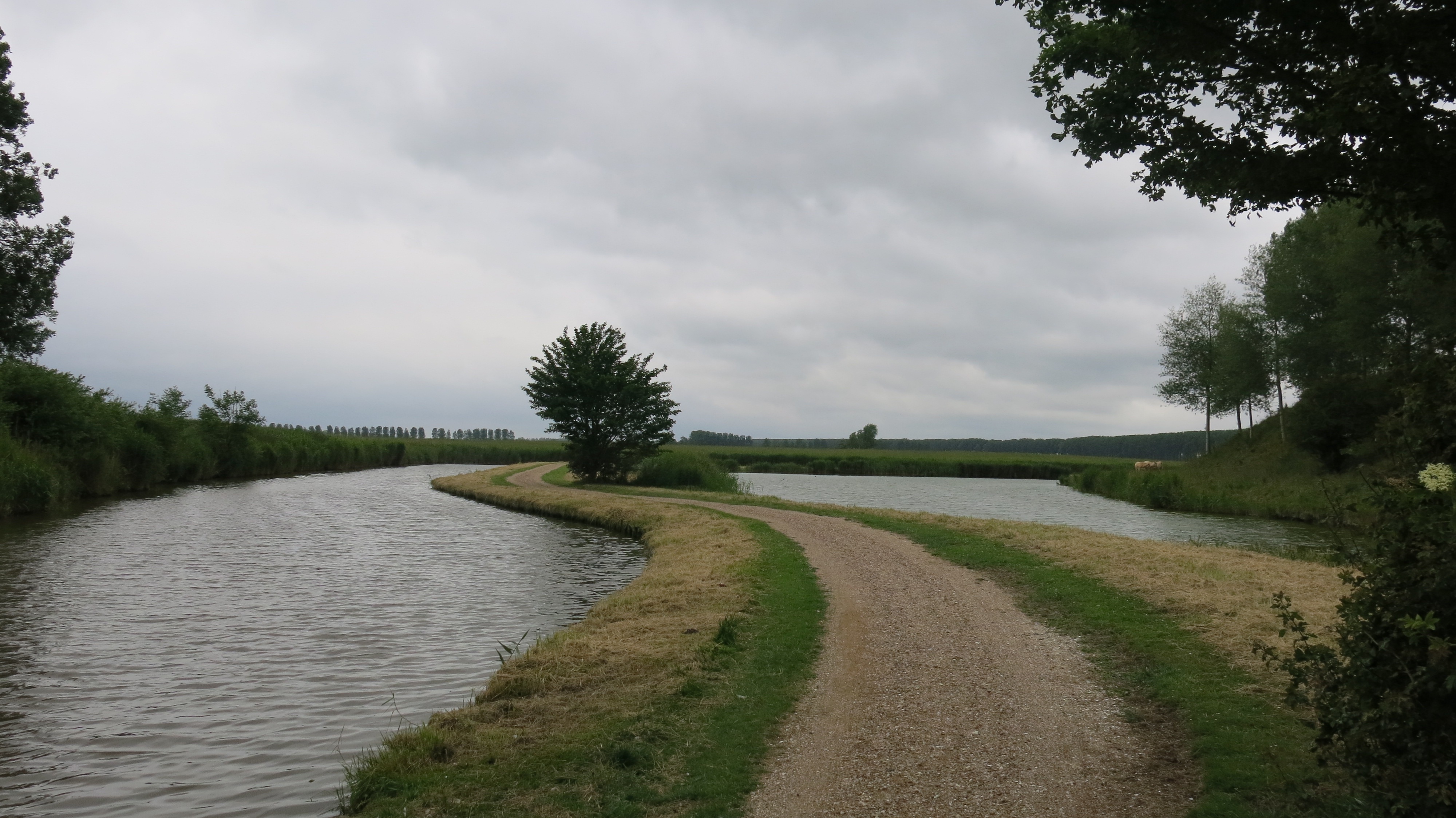 Rechts zie ik rijen bomen. Die zijn karakteristiek voor Zeeuws-Vlaanderen, maar ook aan de Belgische kant (kanaal naar Damme bijvoorbeeld). Ik heb nog in 1983 rond Sluis gefietst en ook op de molen De Brak aldaar gedraaid.