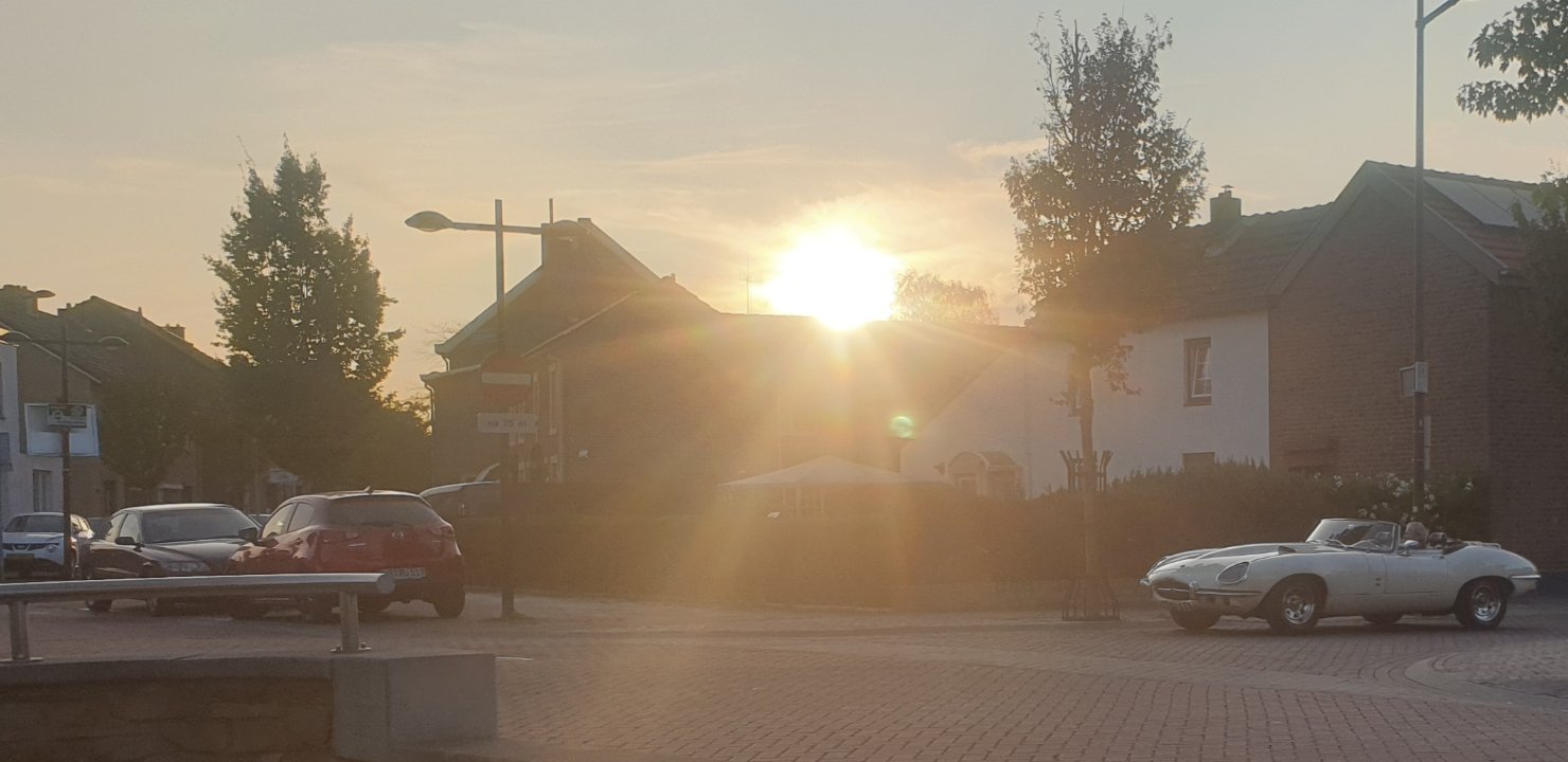 Het straatwerk is Zuid-Nederlands. Het whatsappbuurtpreventiebord is sowieso Nederlands, ik heb 'em zelf ook. De rode Mazda is een Belgische grenstoerist. Het partytentcafeetje is een Duitse stijl kegelbaan. De pixels duiden op een oude telefoon met matige camera. De foto is genomen in juli even na half 10 in westelijke richting.