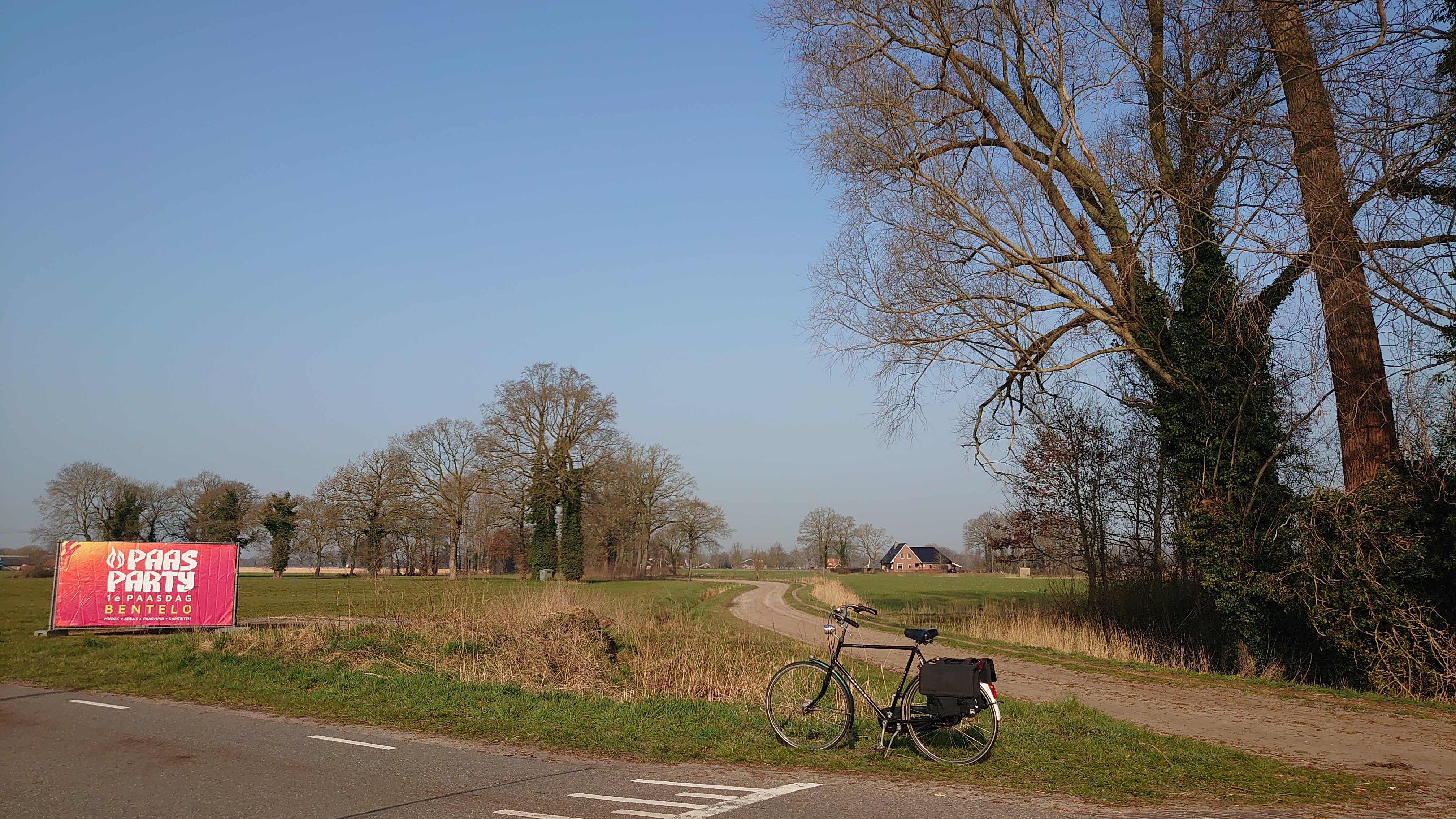 Lastig geval. 🤔 Op het spandoek staat Bentelo. Op Google satelliet de plaatsnaam invoeren. Dan zie ik een rode rand rondom het dorp. Misschien staat het spandoek ergens langs die rode rand opgesteld. Maar die zandweg onder een scherpe linkse hoek is daar nergens te vinden. Bij het inzoomen op satelliet wordt de rode rand steeds vervaagd…