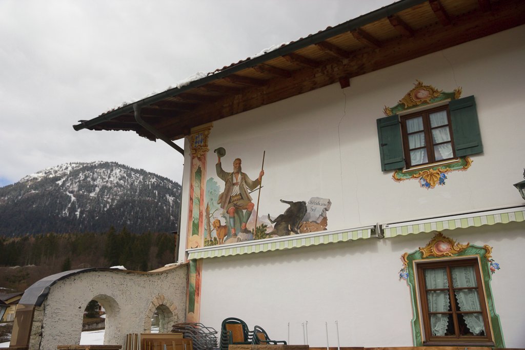 Ik denk Zuid-Tirol. En het zal dan wel ergens langs een 'bekende' fietsroute zijn. In Google zoeken op "wandmalerei haus sudtirol" aangevuld met woorden die het tafereel* duiden leverde helaas niet het juiste resultaat op.
