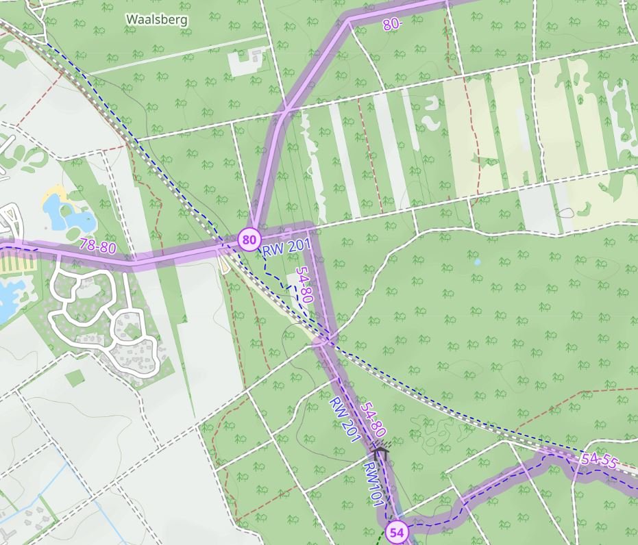 Vervolgens OSM in stelling gebracht en gekeken waar een knooppuntroute deze spoorlijn kruist.