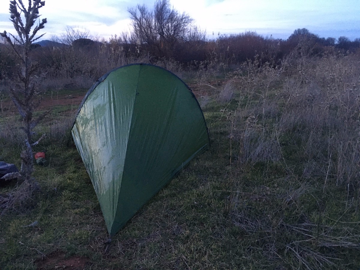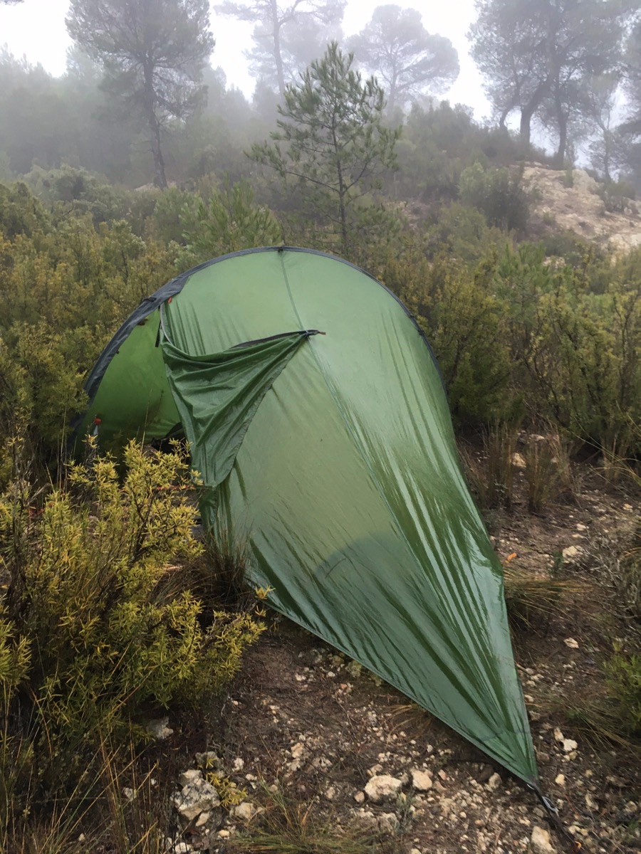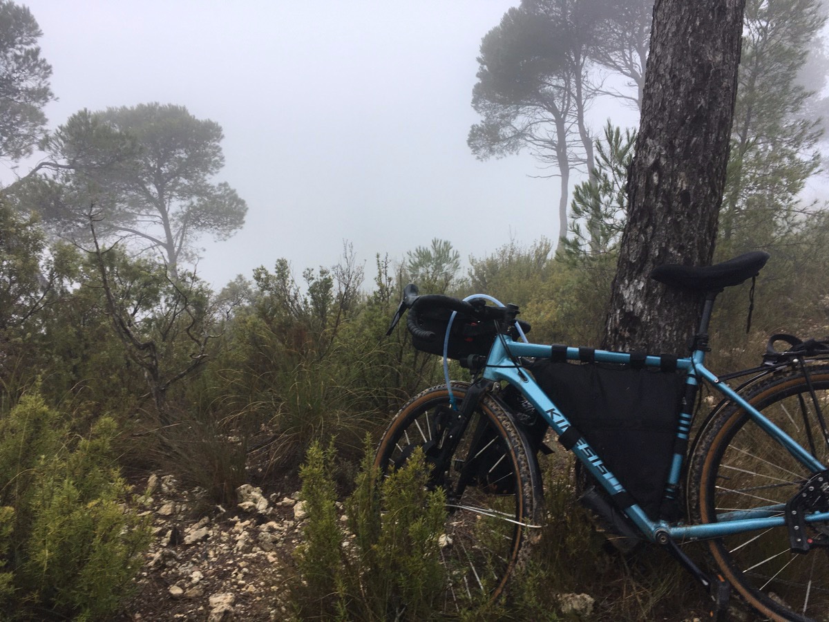 ‘s Morgens blijk ik in een wolk te zitten. Van het prachtige uitzicht zie ik niets meer. Het is echt druilig wat niet tot spoed bij opbreken aanzet. Ik moet ook nog mijn wijsvinger verzorgen want het gepuzzel met de tent gisteren heeft een ferme vil in het vlees opgeleverd; langs een piket geschoten die verzet moest worden. Wanneer ik de fiets met bagage terug naar boven, naar de weg heb gesleurd ben ik kletsnat van door de druipende struiken en kletsnat gras te duwen.