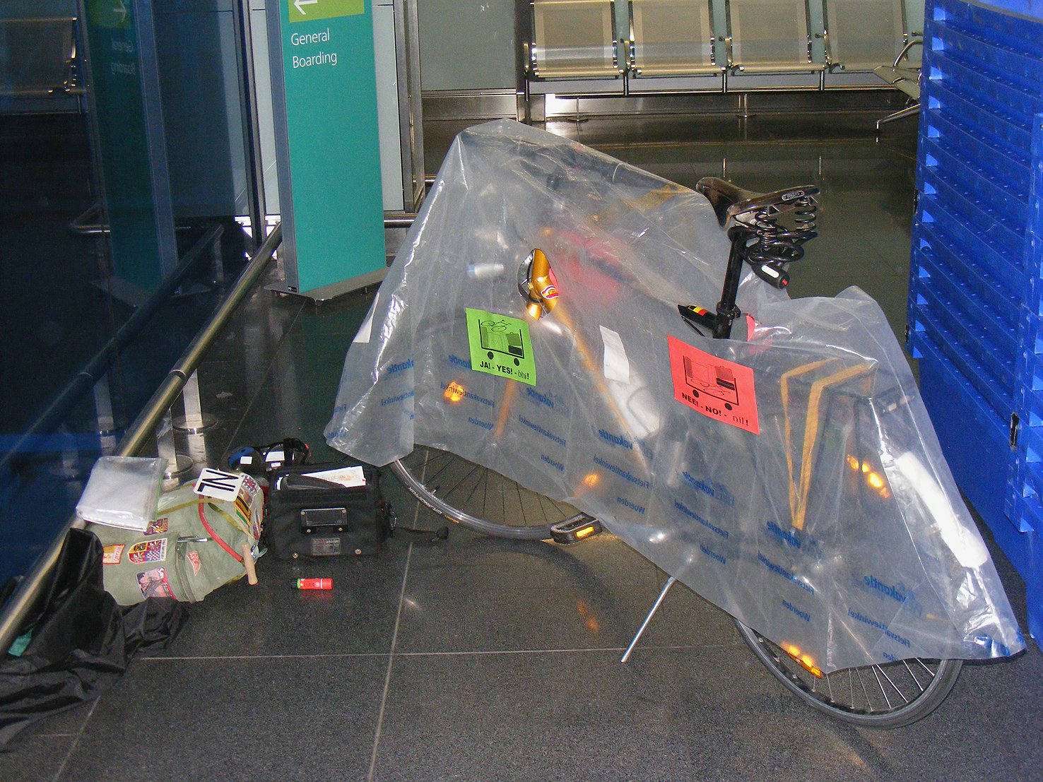 Op de foto waren de pedalen nog niet eraf geschroefd en de banden ook nog niet leeg gelopen. Dublin Airport.