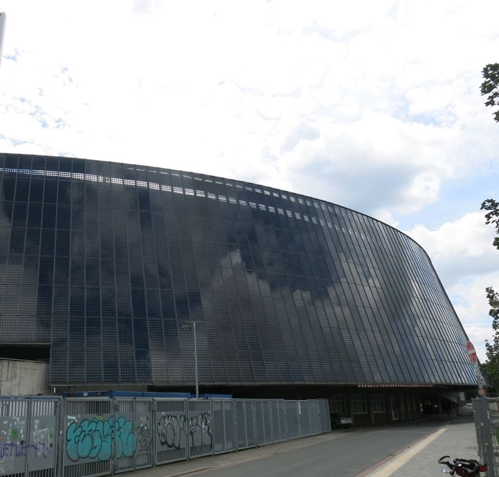 Dit is het voetbalstadion van Werder Bremen, heb herkend toen ik van Lufthafen Bremen opsteeg naar Stockholm. Heb er nog een video van genomen. De weg op de voorgrond is Auf dem Peterswerder, maar op Google Streetview is het stadion in 2009 nog in aanbouw. Daarom een andere plek voor oplossing. https://www.google.nl/maps/@53.0664368, ... 080!8i3040