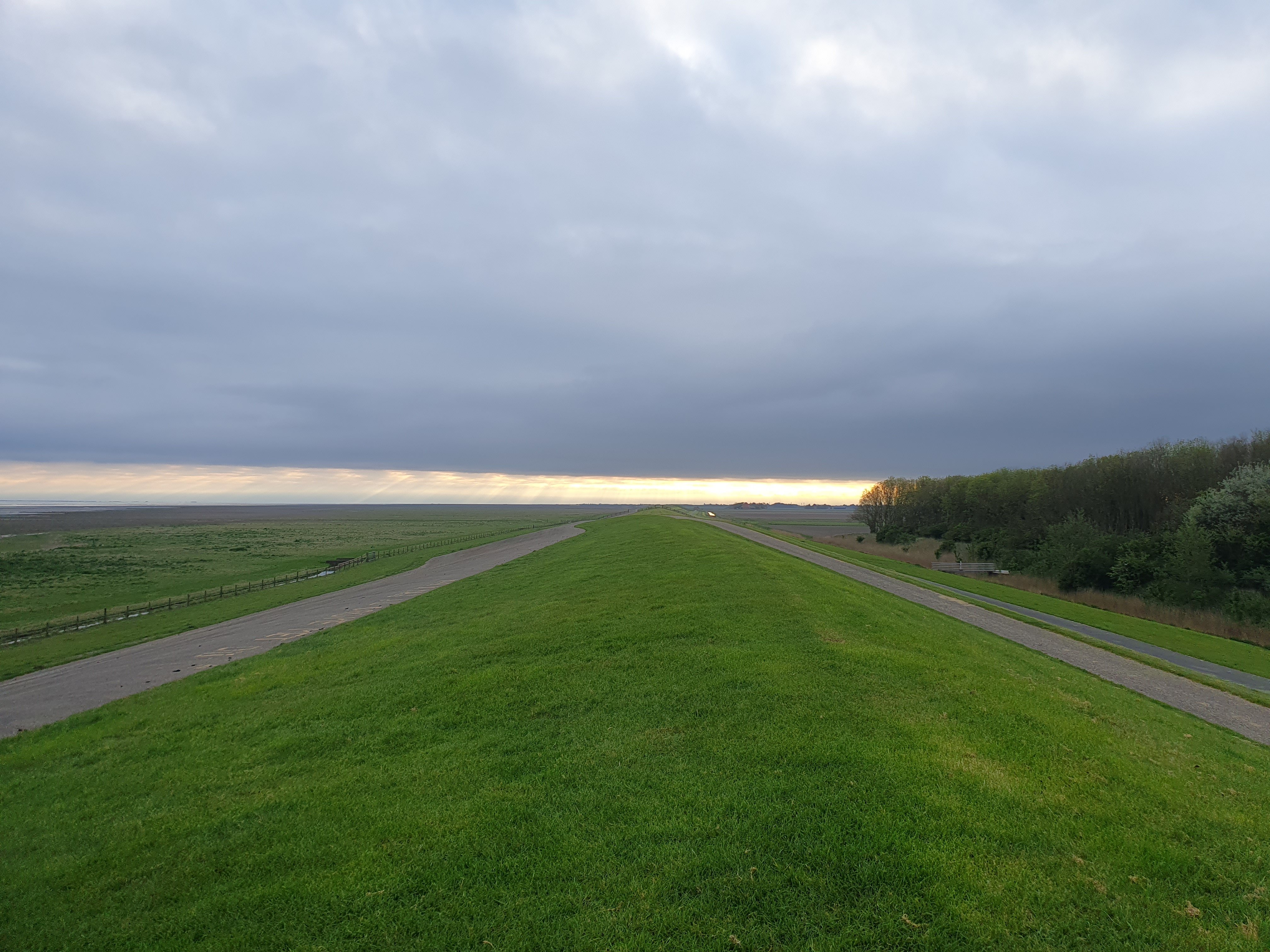 Niet vandaag, en zelfs niet gisteren, maar eergisteren stapte ik om ongeveer zes uur bij ons tijdelijk verblijf in Franeker op de fiets om een tochtje langs de zeedijk in oostelijke richting en dan wat zuidelijker weer terug te maken. Hoewel het nergens in de verwachtingen stond (dacht ik toch) begon het vrijwel direct wat te miezeren. Onder het A31-viaduct het niet zo waterdichte jasje verwisseld voor mijn regenjack. Door Tzummarum in noordelijke richting tot ik op de zeedijk stuitte. Schapen, lammetjes, schapen, lammetjes, een onafzienbaar aantal, ik denk dat ik er wel meer dan duizend gezien moet hebben. Schapen zijn voor mij erg onvoorspelbaar in hun bewegingen, dus handen aan de remmen houden.
