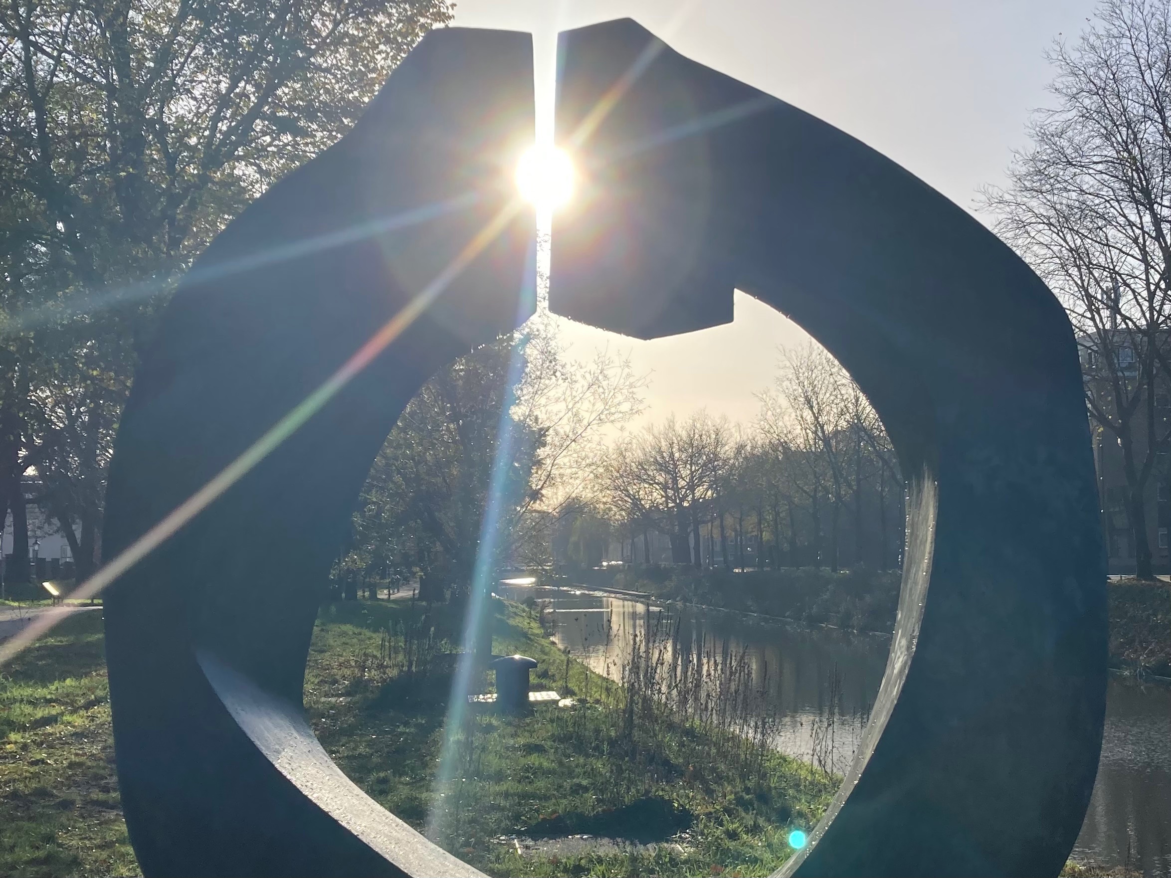 Gezocht op "kunstwerk openbare ruimte open cirkel". Dat leidde tot een site met als titel "Beminde zaterdag" (*) waarop een foto van het beeld stond, gepositioneerd aan de Catharijnesingel. Daarna Streetview gehanteerd.