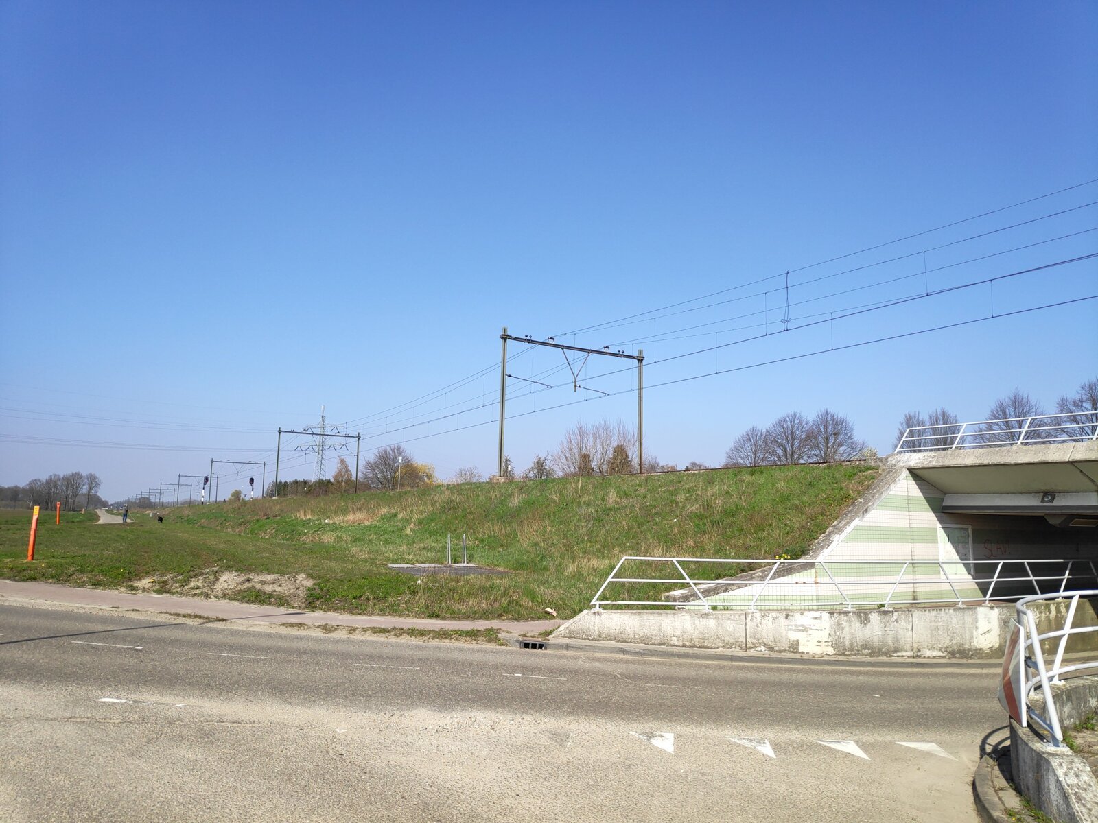 De bodem en begroeiïng op de foto ademt Limburg, net als de onderhoudstoestand van berm en beton. Dus was het alleen maar zoeken naar de kruising van dubbel geëlectrificeerd spoor ten noorden van Weert (de rest ken ik) waar een hoogspanningsleiding over kruist en een weg in noordelijke richting links langs het spoor ging lopen. Zo gepiept, want het ligt krap 2 km buiten Weert.