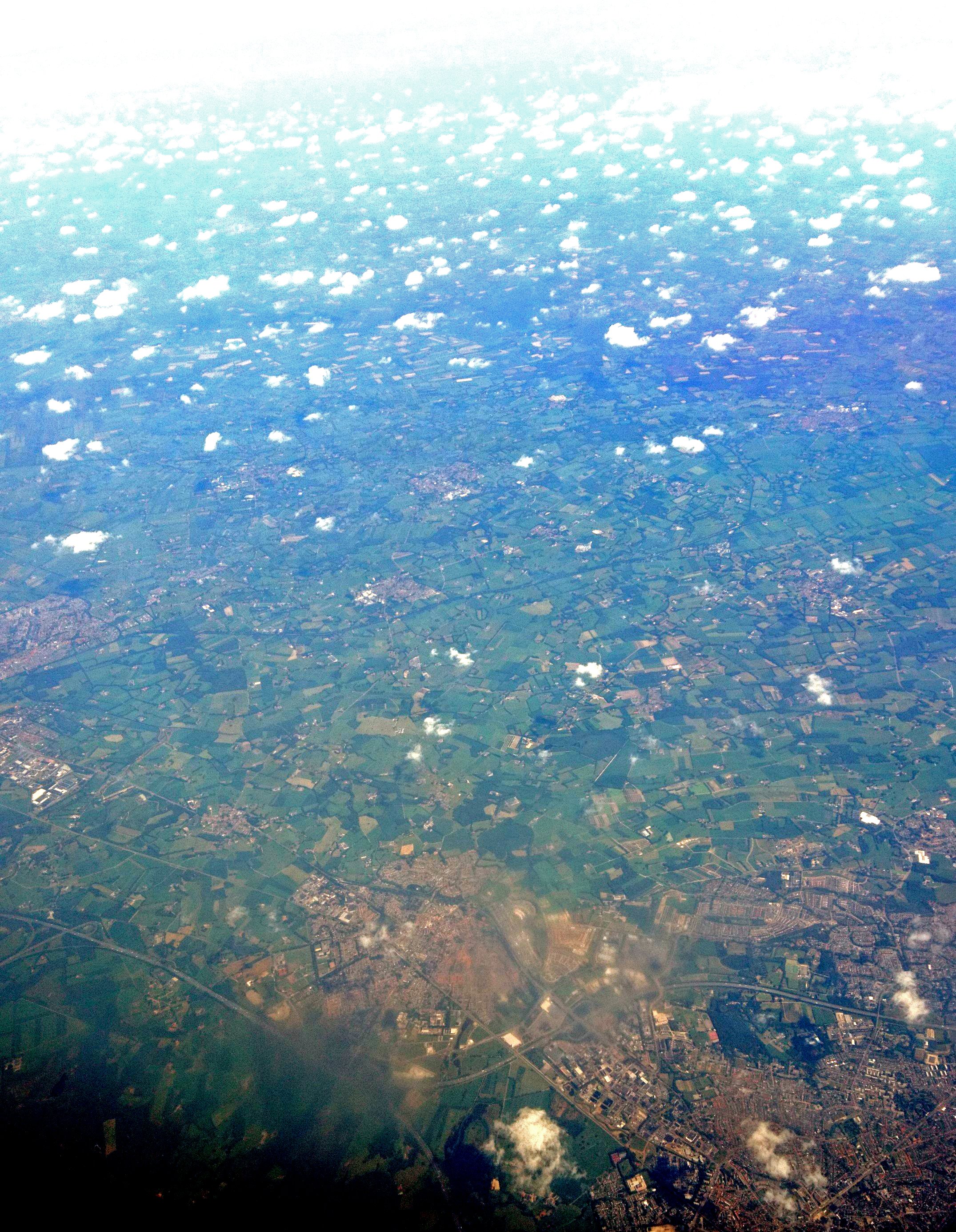 De luchtfoto is wat te vaag. Ik heb de contrasten en kleuren verbeterd en ook scherper gemaakt. Ik zie overal kleine graspercelen die omzoomd zijn door heggen. Dat moet dit wel in Engeland zijn. Loopt die waterweg ongeveer van acht uur naar twee uur zoals op een klok?