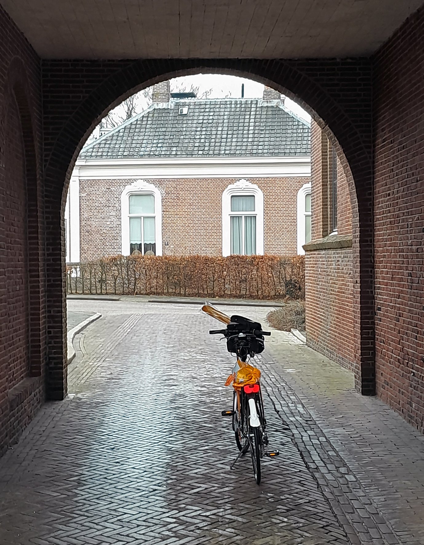 Er is ook Streetview onder de poort van de gereformeerde kerk, hoor! Vanmorgen ging ik effe een stokbrood halen voor bij de soep, die ik vanmiddag heb gekookt. Je ziet hem uit m'n stuurtas steken.