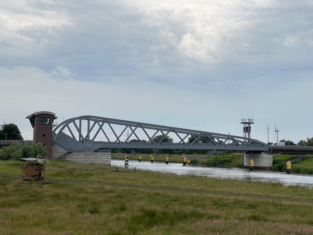 De brug ziet er nieuw uit, daarom moeilijk te vinden. Die toren met de antennes achter de rechter brugpijler, is er een vliegveld in de buurt? Als baken voor het aanvliegen? Niet gevonden op de Ringvaart rondom de Haarlemmermeerpolder. Ook niet rondom Zestienhoven. Daar is het landschap te rommelig voor.