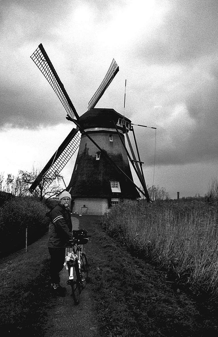 Normaal zijn de beroemde molens van Kinderdijk voor bezoekers niet te bezichtigen, maar de molenaars aldaar hadden op 20 november 2004 de Kinderdijkse molens speciaal voor molenliefhebbers opengesteld. Die kans liet ik natuurlijk niet aan me voorbij gaan. Per trein naar R'dam-Alexander en dan verder gefietst. Maar het was een erg ongure dag, met dramatische wolkenpartijen op zwart-wit foto's. Door de veenverzakkingen verkeerde de betegelde fietspaden vanaf Alexander ook nog in slechte staat, wat me driemaal lekke banden opleverde....