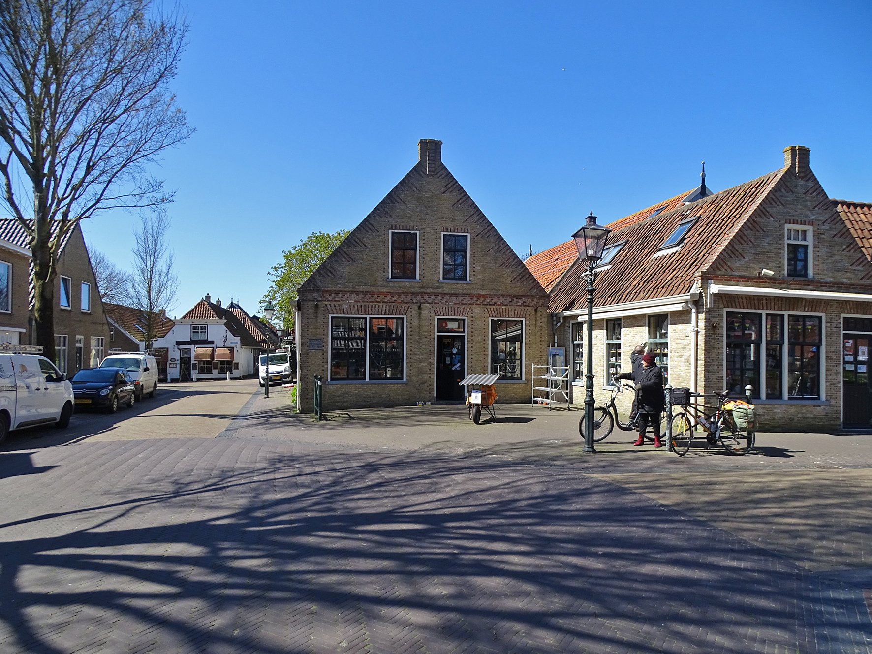 Heel goed, JanH. Ik heb de naam op de gevel mooi geblurd door stenen van lege plekken te kopiëren en over de beletteringen heen plakken, maar niet aan de etalage gedacht. Dacht ik vrijwel niks herkenbaars te zien. Mijn fiets staat geheel rechts, daarnaast mijn vrouw. Achter mij de kerk van Midsland, qua omvang de grootste kerk van Terschelling.