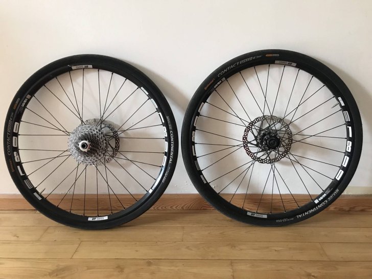 Deze set heeft mij 50€ gekost, heeft nauwelijks gebruikte 180mm remschijven, een bruikbare 10 speed 11-36T cassette en nieuwe continental banden. Bovenal, de set heeft DT Swiss 350 naven met end-caps voor steeknaven en, voor zover ik kan voelen, slechts één versleten lager dat ik nog op reserve heb liggen... Nu alleen nog end caps kopen om de voornaaf van 15x100mm op 12x100mm te krijgen... De bedoeling is een tweede wielset voor de gravelbike te maken met dunnere banden voor plaatselijk gebruik.