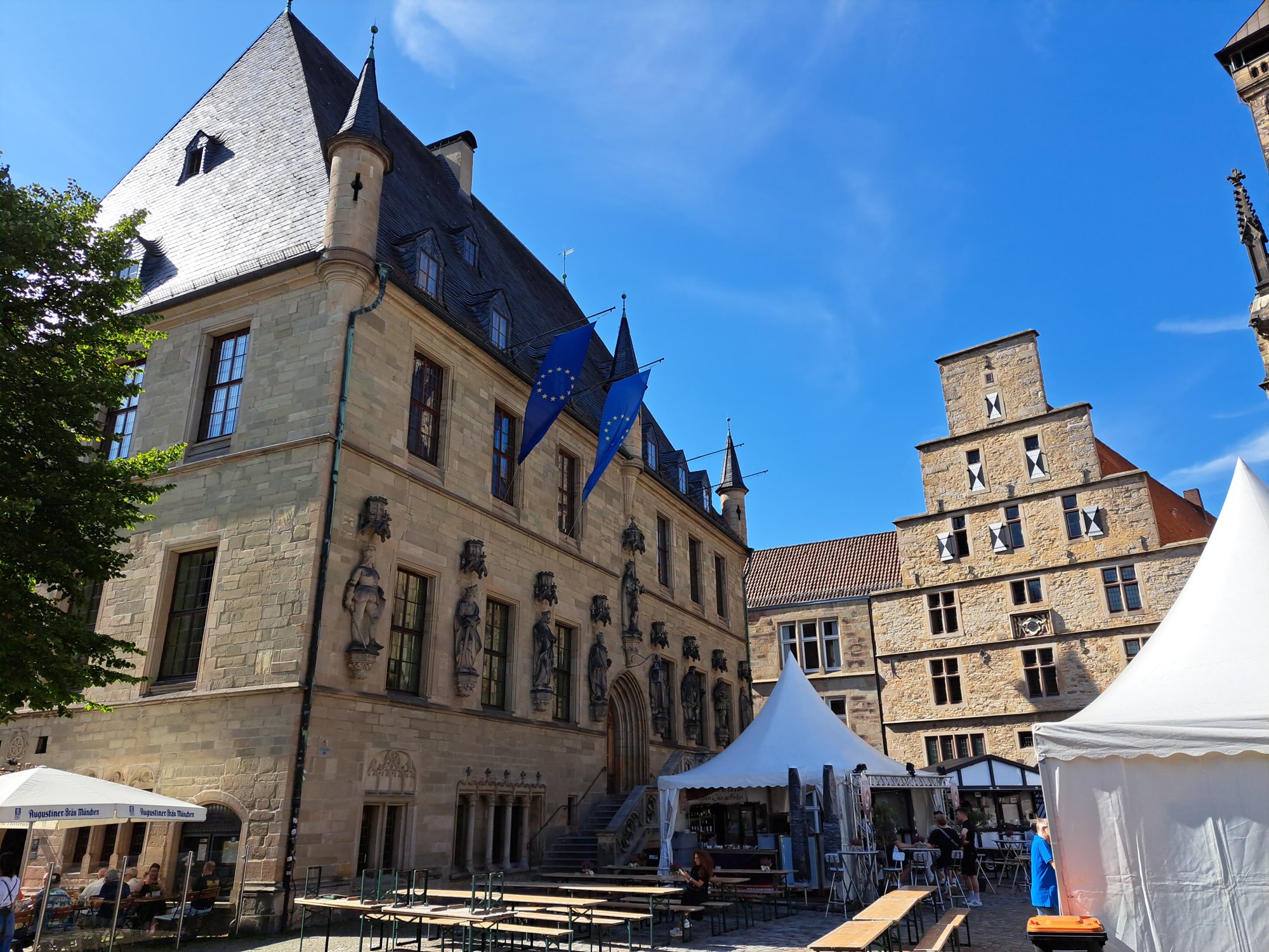 Echt Duitsland. Het gebouw links lijkt me een Rathaus. De hoektorentjes doen me denken aan Echternach. Gezocht op Google afbeeldingen met "gotische Rathäuser Rheinland-Pfalz", welke aan Luxemburg grenst. Niks gevonden en alle andere deelstaten ook al niet. Bayern, gezien het biermerk links, ook niet. Ik geef het op....