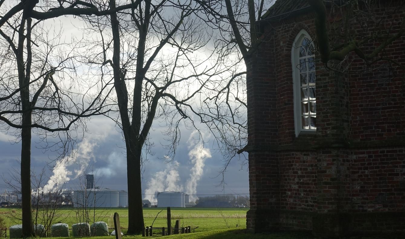 Ik dacht meteen aan Heveskes bij Delfzijl, een kerkje midden in een industrieterrein, maar die heeft een rechtgesloten koor zonder ramen. Er is geen andere kerk in de buurt.