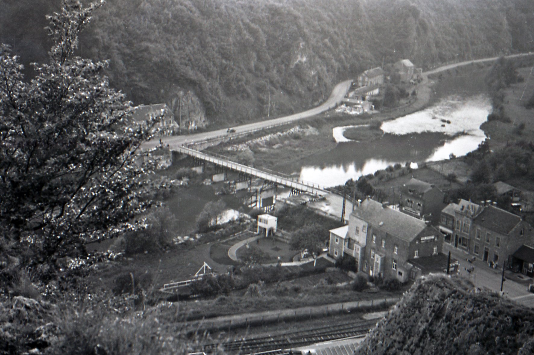 Nog even terugkomend op de zwart-wit foto van Comblain-au-Pont in 1951: m'n vader schreef in z'n verslag dat er in de 2e Wereldoorlog veel bruggen in de Ardennen zijn verwoest en je ziet hier een houten noodbrug. Toch een stukje geschiedenis.