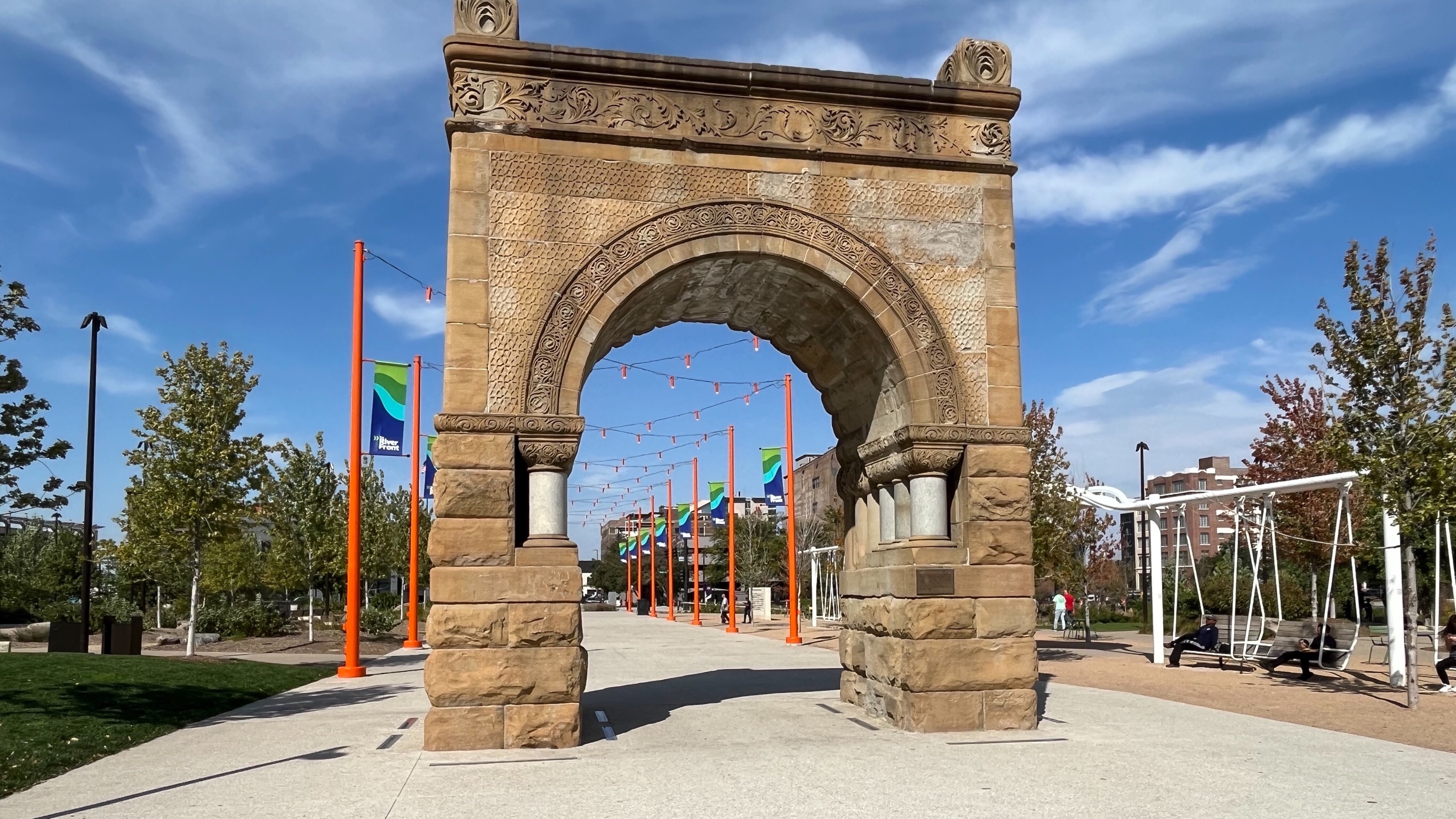 Makkelijk zat, de "River Front flags" opzoeken en ik kwam uit op Omaha, Nebraska USA: https://3ten.ca/travel-the-river-front/ en verder zoeken naar "Arch in Omaha": https://www.google.nl/maps/@41.2575848, ... ?entry=ttu