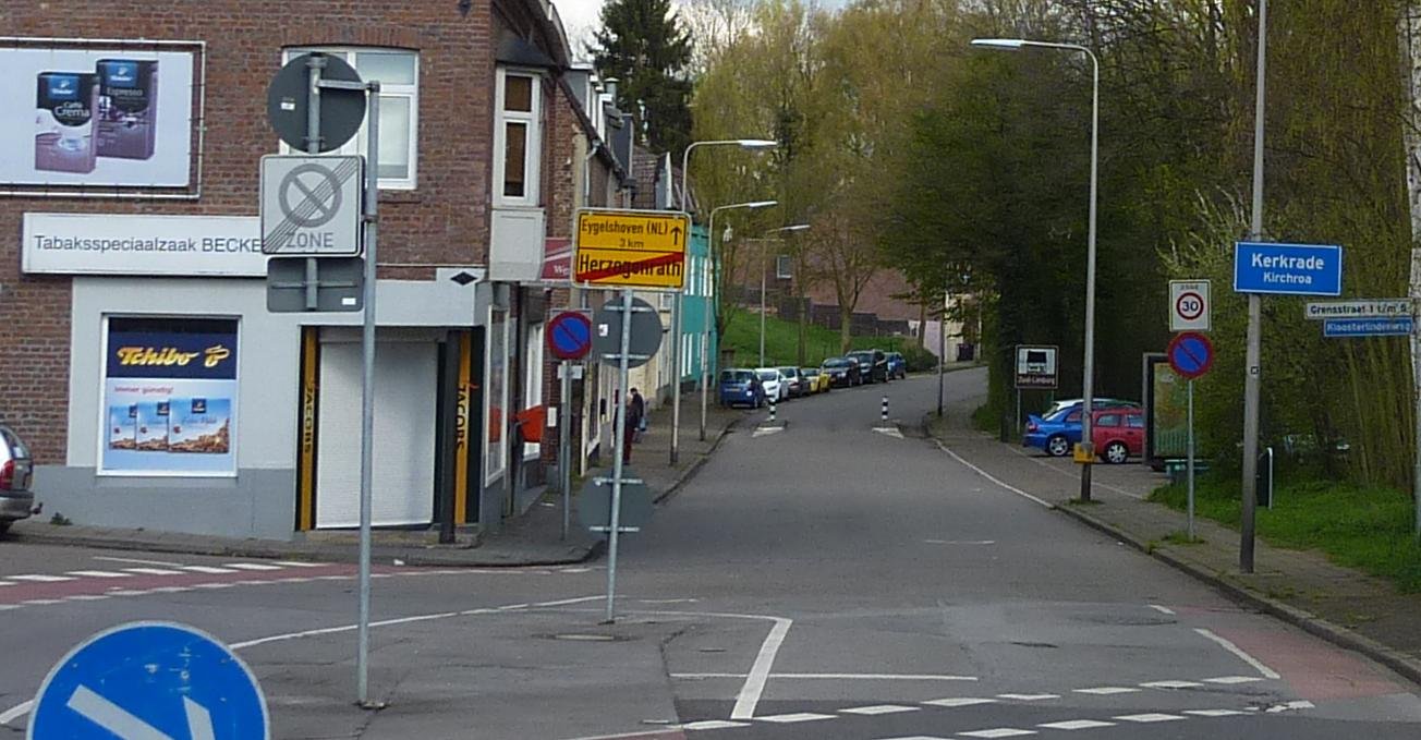 Je staat in Duitsland op de Eygelshovener Straße in Herzogenrath, terwijl de huizen in Nederland staan, te weten: links de Kloosterlindenweg en rechtdoor de Grensstraat in Haanrade. Kan geen url van Streetview op m'n smartphone kopiëren. Het staat wel op mijn computer, maar daar heb ik nog last van inlogproblemen....