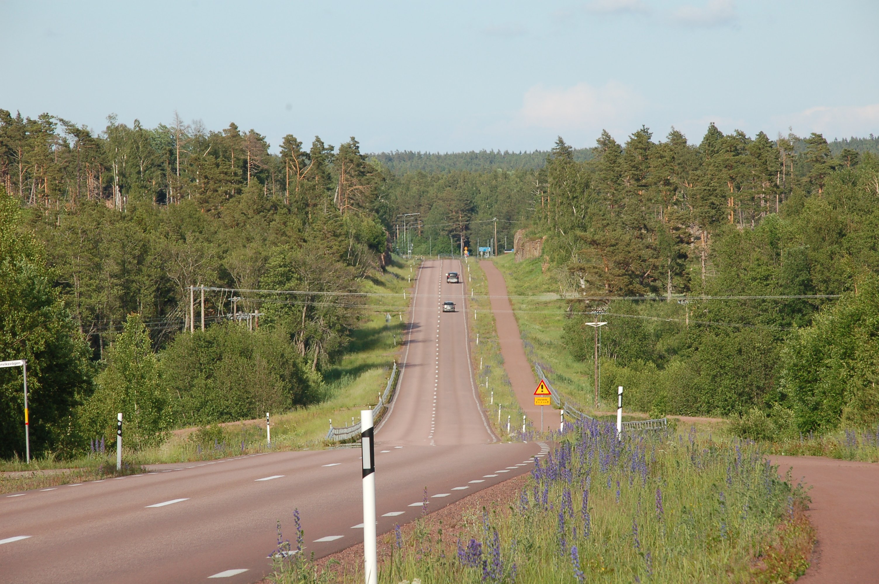 Kan ik in twee seconden zien dat dit in Zweden is! Nog ruim een maand geleden geweest. De lupinen op de wegbermen, die komen het meest in Värmland voor, vaak in midden-juni. Rood asfalt komt daar veel voor, eigenlijk is het asfalt vermengd met fijne grit van rode granietsteen. Het witte straatnaambordje links heet ....rviksvägen. Veel te veel mogelijkheden opzoeken naar de ontbrekende letters. Kärrviksvägen, Lerrviksvägen, Österviksvägen, Sörviksvägen en ik kan zo wel eindeloos doorgaan. Van die soort lokale zijweggetjes, vaak onverhard.