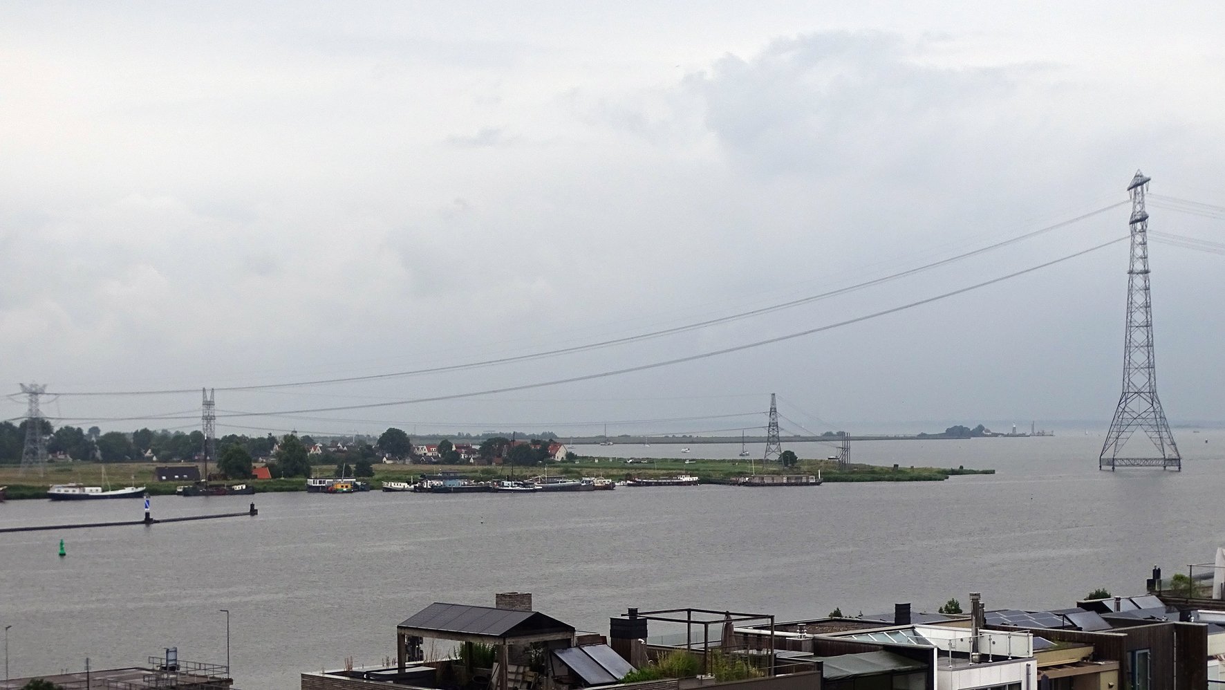 Hier staat dezelfde hoogspanningsmast, vanwaaruit de draden steil omhoog gaan naar de hogere mast, die bij jou net links buiten beeld staat. Ongeveer halverwege links van het midden ligt een woonark met ervoor een geel geval. Iets schuin linksboven die ark herken je het bekende torentje van Durgerdam (dubbelklik om te vergroten). Links buiten beeld ligt de Schellingwouderbrug, die al onlangs als raad plaatje is gebruikt. Vandaar dat ik na enig twijfel Amsterdam heb genoemd. Je moet dus wat verder op de achtergrond hebben gestaan!