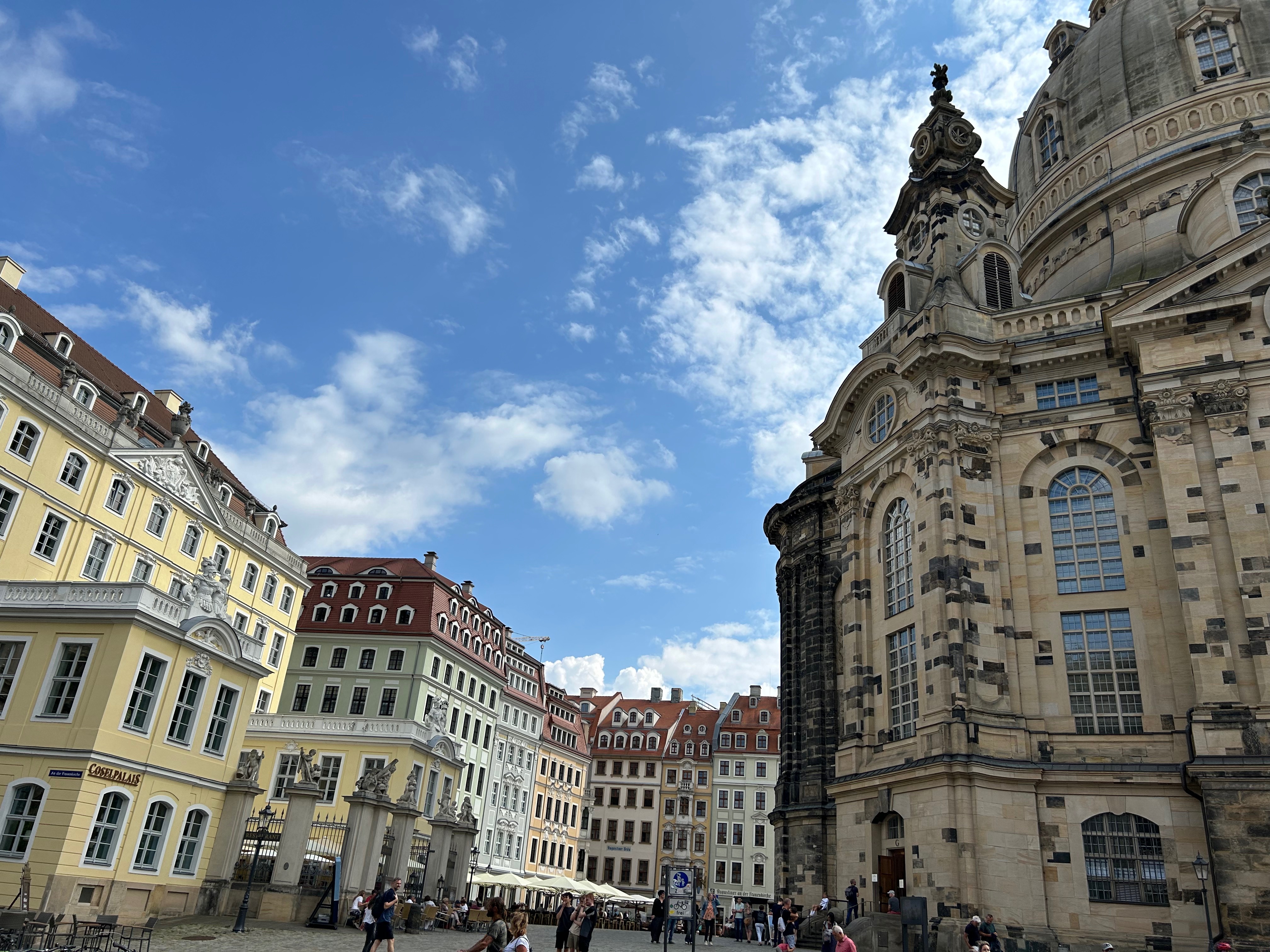 Dat is heel gauw opgelost. Mijn foto is van 16 oktober, heb enorm mazzel dat ik midden herfst al die dagen mooi zonnig weer heb gehad! Wel wat fris van temperatuur. Inderdaad de schaduw van de Frauenkirche. Ik heb 'Coselpalais' linksonder weggeblurd....