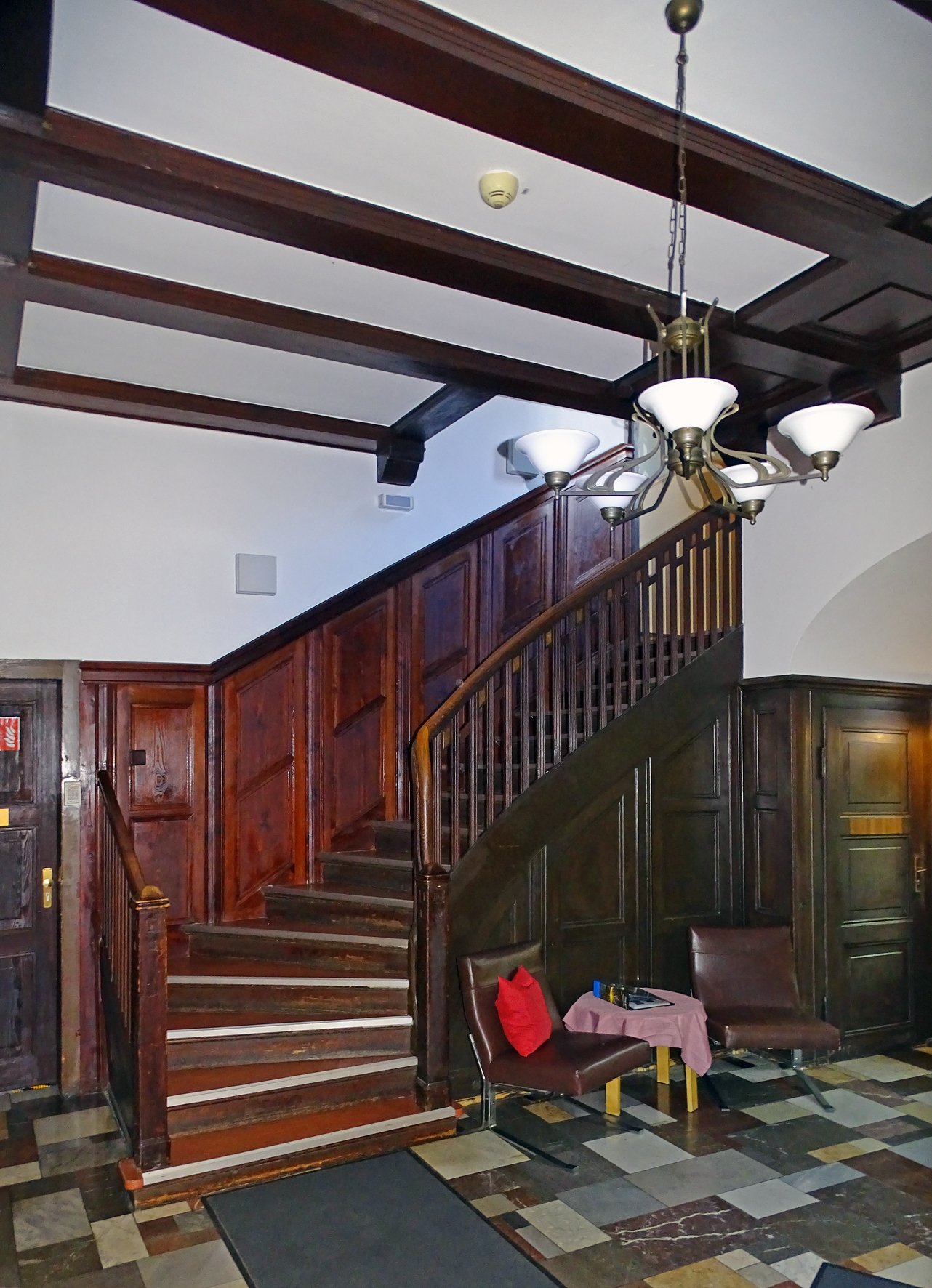 Ik zie iets rechts een meiboom staan, die blauw-wit gespiraald is. Bayern!