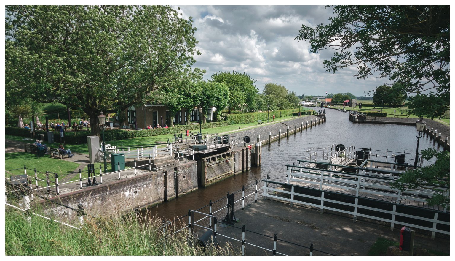 Ik ontwaar links in de verte een witte ronde stenen stellingmolen. Bijvoorbeeld Zuilichem. Heb van alles geprobeerd met "historische of oude spuisluizen", of "Hollandse waterlinie" of "Stelling van Amsterdam". De sluis heeft minstens zes openingen, nogal zeldzaam. Het water links ligt laag en rechts hoog. Naar mijn gevoel ergens Midden-Nederland. Maar noppes....