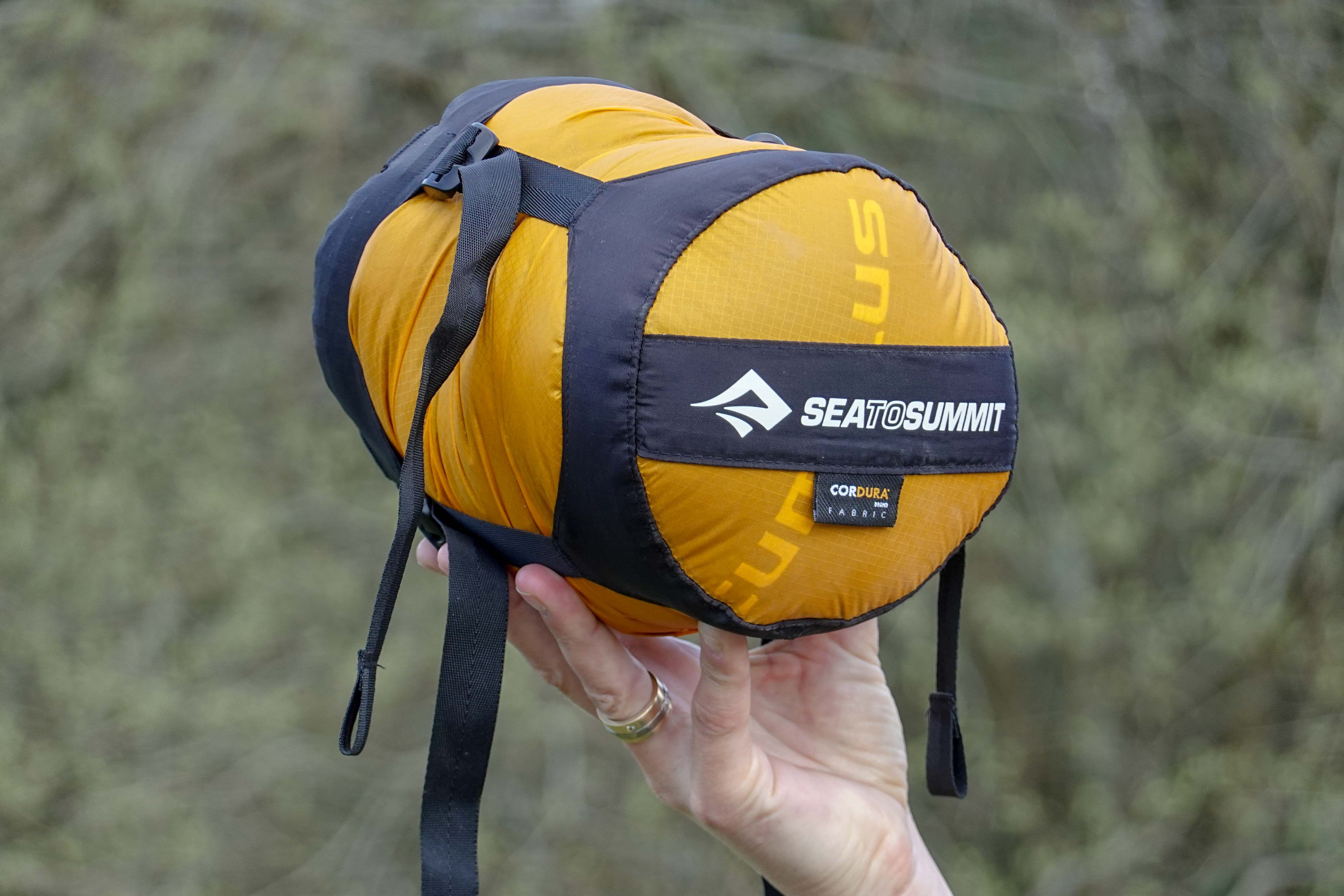 De compressie zakken van Sea to Summit heb je in allerlei formaten. Ze zijn genaakt van zeer licht gewicht doel. Lijkt een beetje op tentdoek. In maatje XS past onze 3 seizoenen slaapzak. Het resultaat is een klein balletje voor in onze tas. Best wel blij mee.