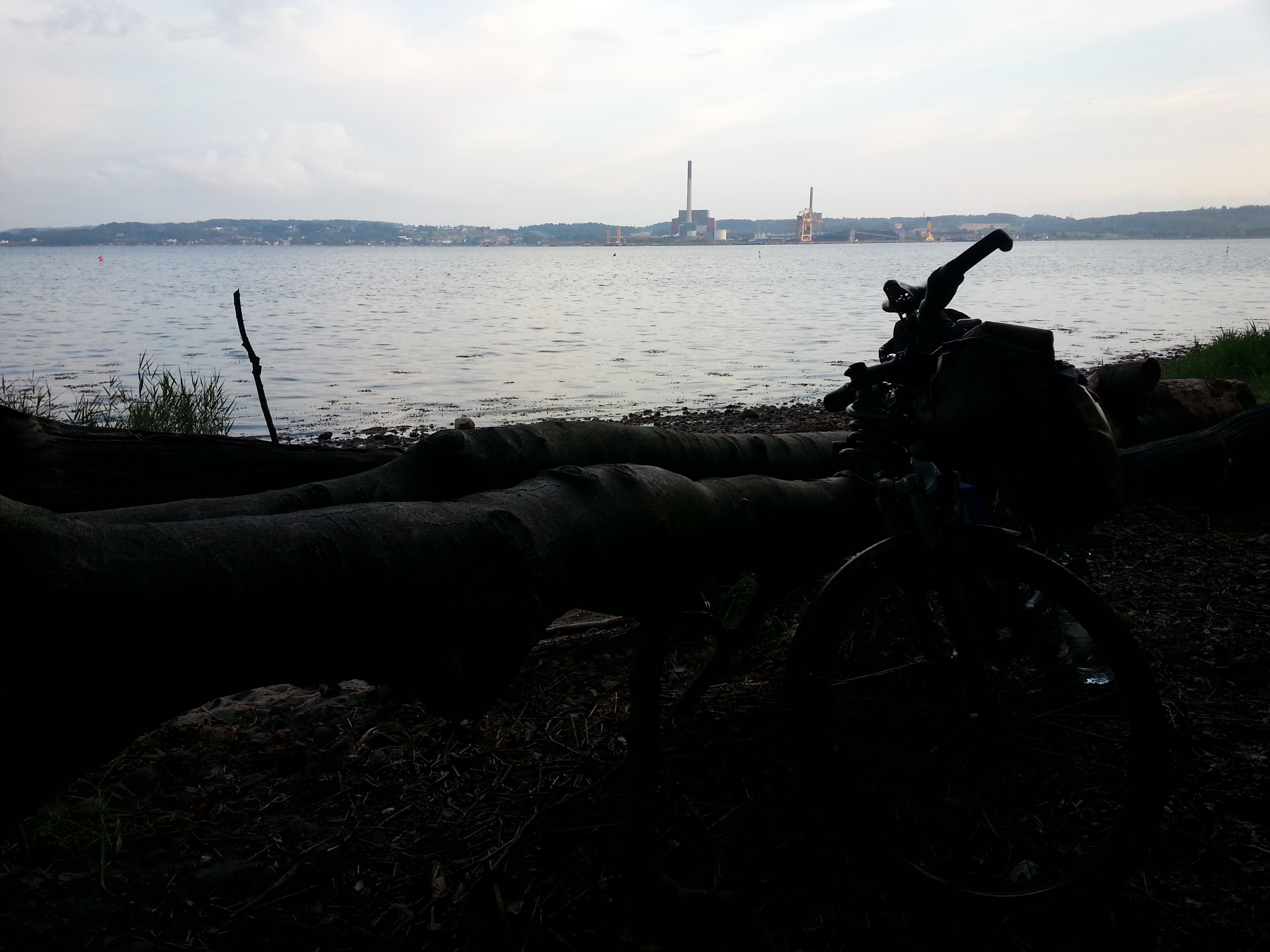 Ja, dat klopt. Er zit één van de Deense primitieve kampeerplekken in het bos, aan het water. Ik heb daar nog gezwommen, met mijn fietsschoenen aan vanwege de stenen. En die heb ik daarna gedroogd bij het kampvuur, waardoor ze nog jaren naar rook roken.