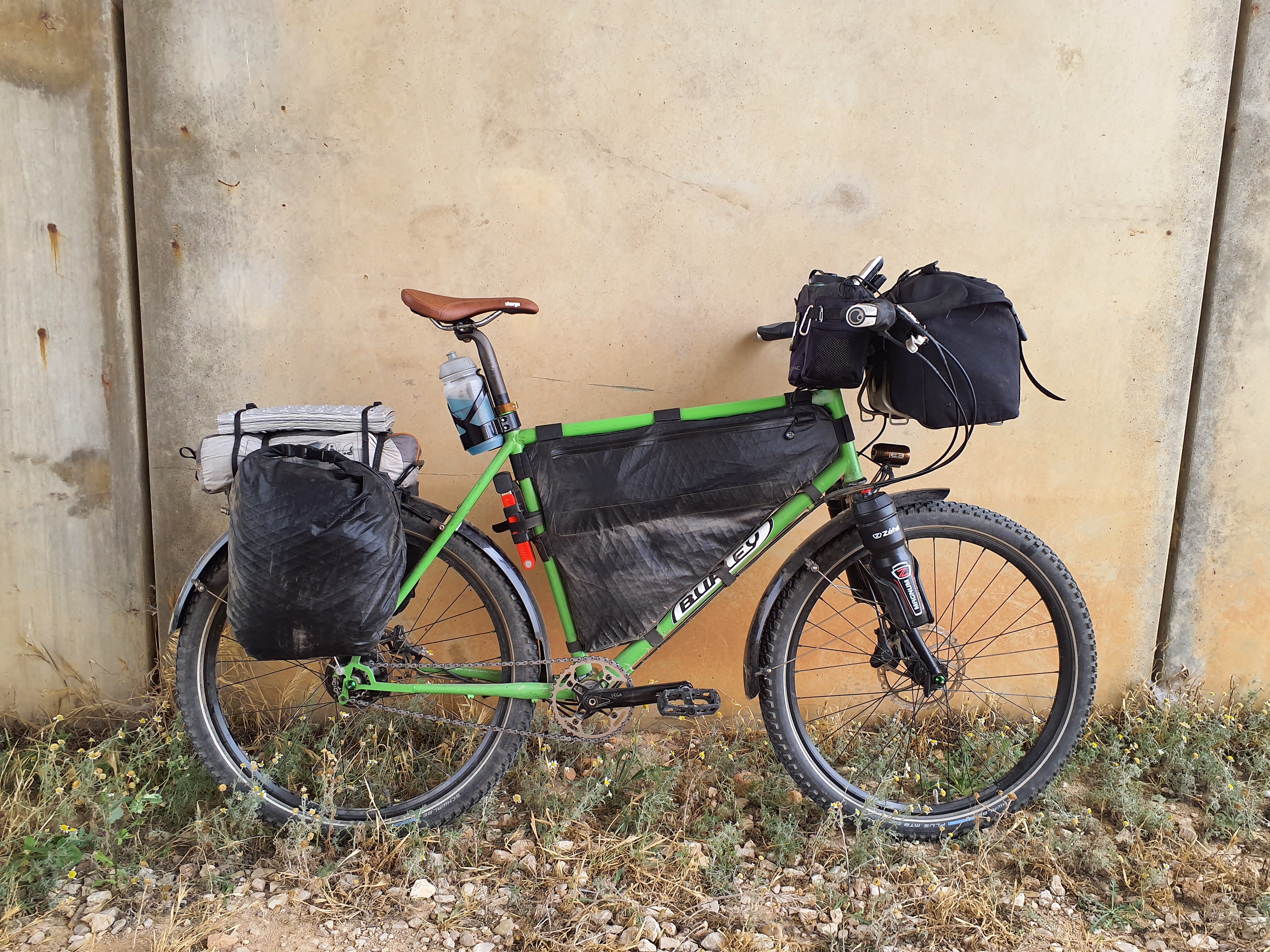 De frametas en achtertassen zijn handwerk van Leonardo Vasotaro. De stuurtas is van Carradice op een Jack the Rack.