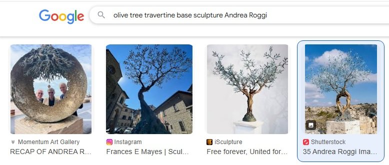 Het is een beeld (genaamd "Aarde en Hemel") van de hand van Andrea Roggi en het staat in Matera regio Basilicata. Ik begon met googlen naar "olive tree travertine base sculpture"' en toen kwam al snel de naam Andrea Roggi boven drijven. Daarna deze naam toegevoegd aan de zoekvraag en toen kwam een plaatje in beeld wat er wel erg veel op leek.