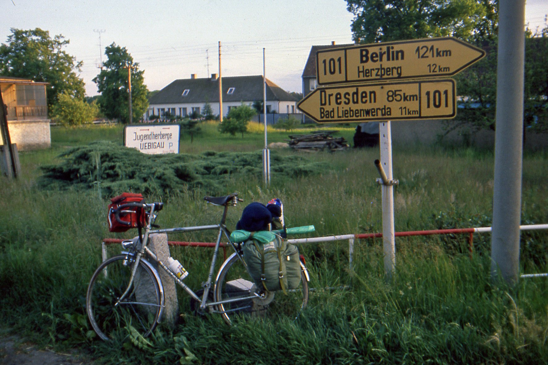Hier bij de bruggen van Grave. Helaas ruim een jaar later brak in België het frame bij de horizontale achtervork. Het viel nog onder de garantie. Via de fietsenmaker is deze gezonden naar de fabriek van Batavus. Later kreeg ik deze fiets kosteloos terug, maar nu met een zeegroen frame.... Vond ik minder mooi. In 2002 naar het oud ijzer weggebracht, totaal versleten. Maar het Brooks-zadel zit nu op m'n gele Giant.