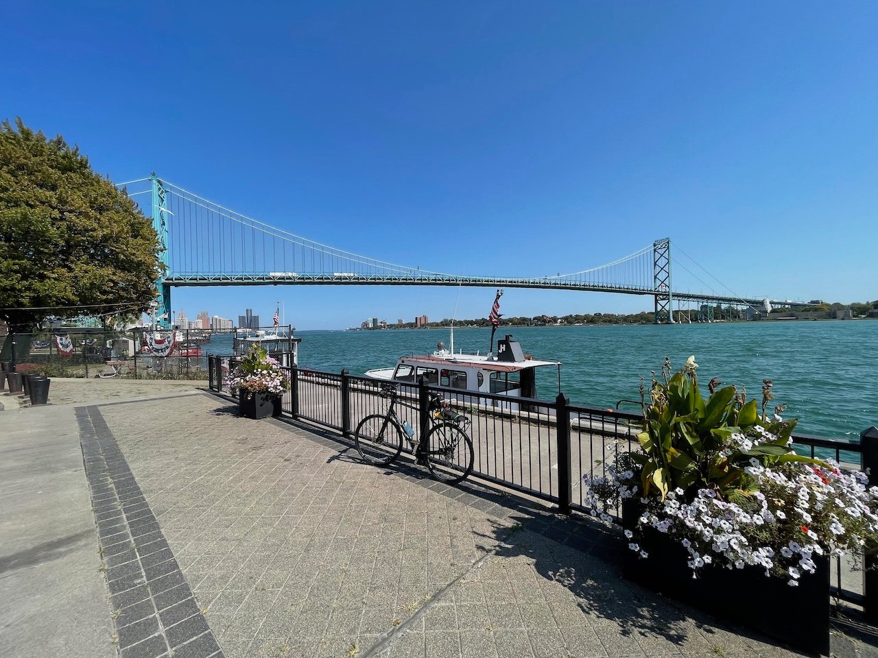 De brug is de Ambassador Bridge, over de Detroit River. De grens USA-Canada ligt in het midden van de rivier.