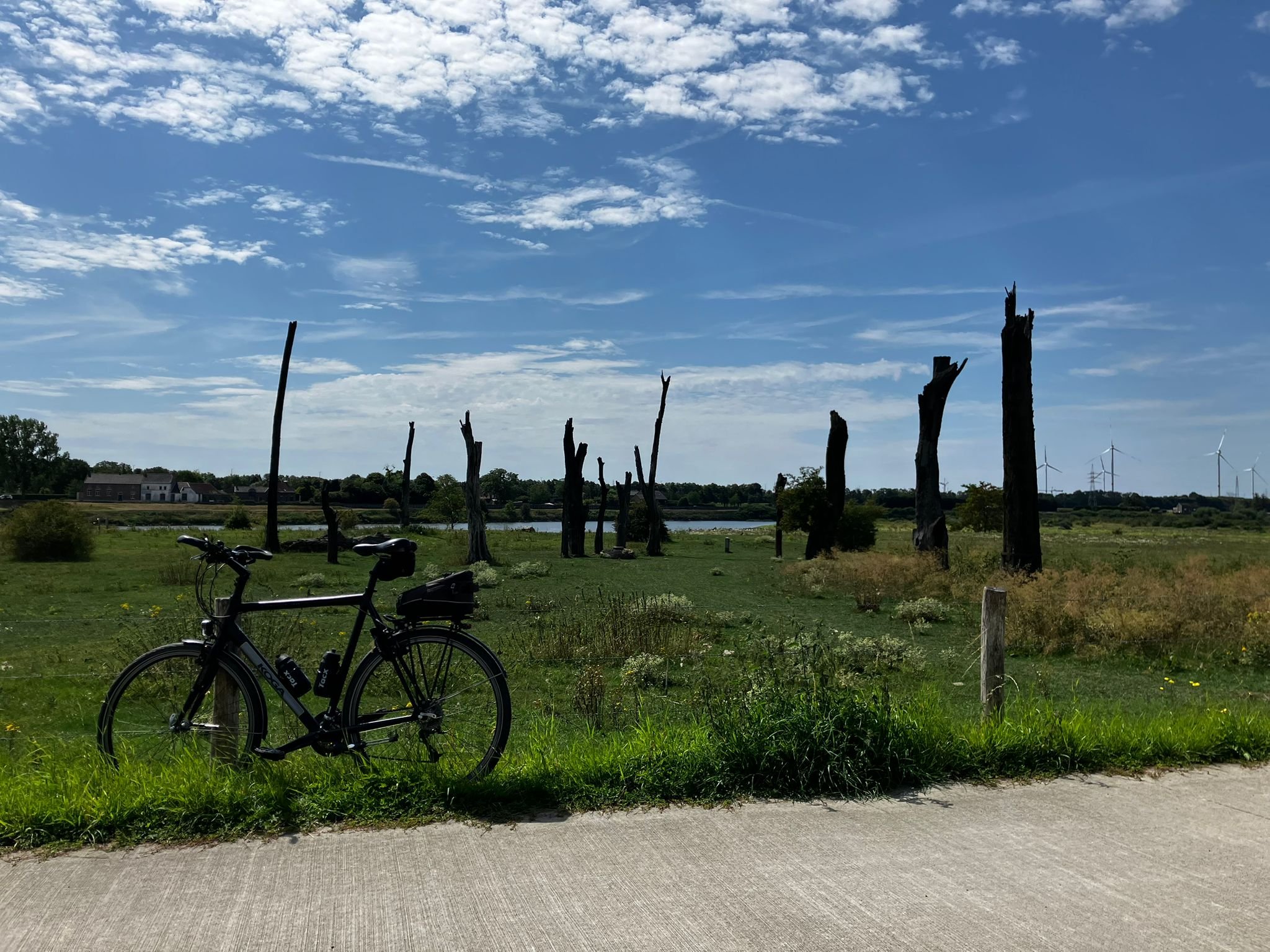 De boerderij links ziet er zuidelijk uit en ik vermoed dat dit de Maas is. Op Google satelliet gezocht in de buurt van de windturbines en gevonden. De boerderij staat in België en de dode bomem zijn de Woodhenge Meers: https://www.google.com/maps/@50.9584591 ... FQAw%3D%3D