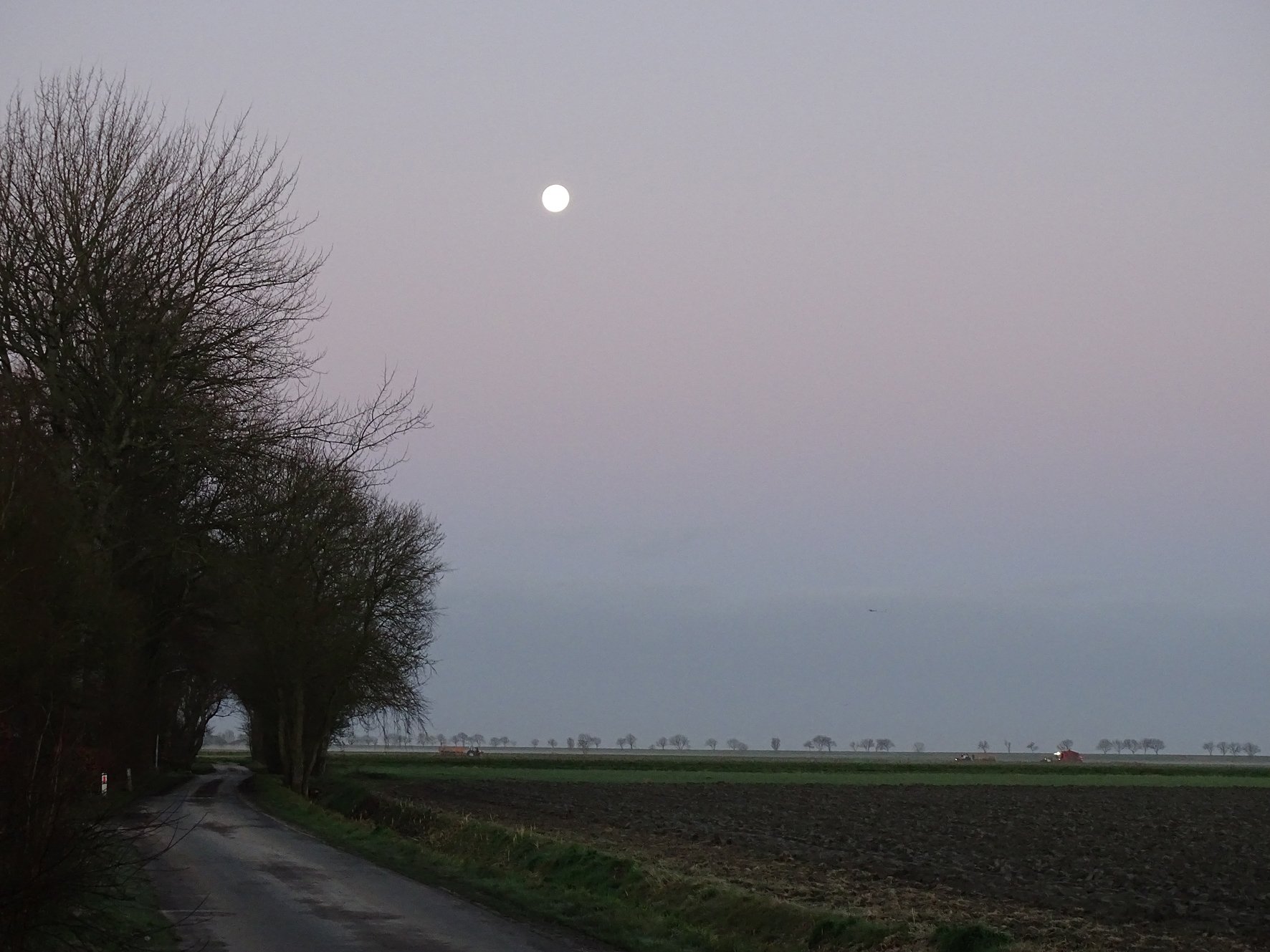 Je moet de maan juist bij schemering vastleggen en niet bij nacht. Dit hieronder is enige seconden eerder genomen, zonder telelens. M'n camera stond op het dak van de auto, die naast mijn huis is geparkeerd. Bij het inzoomen naar de maan wordt de lucht rondom vanzelf donkerder. Daarna op de computer beetje bijgewerkt.