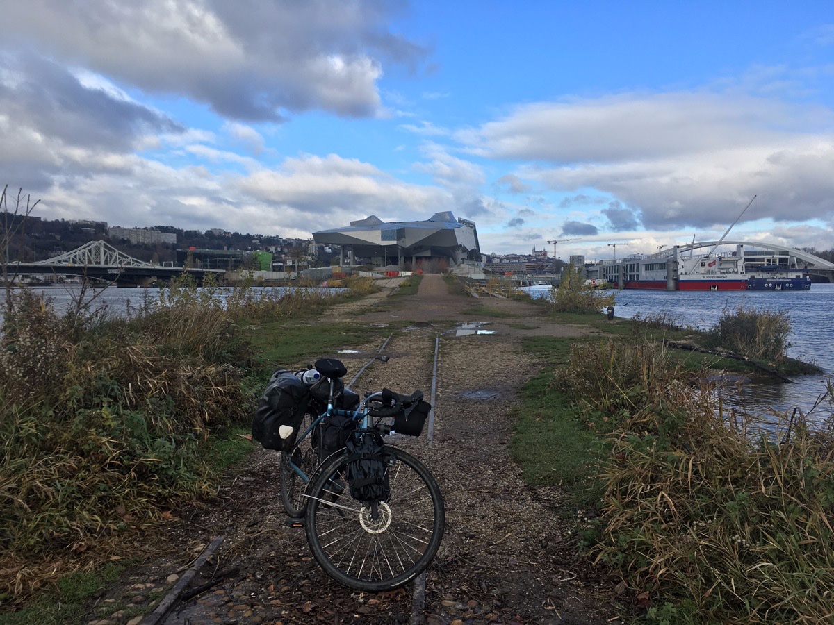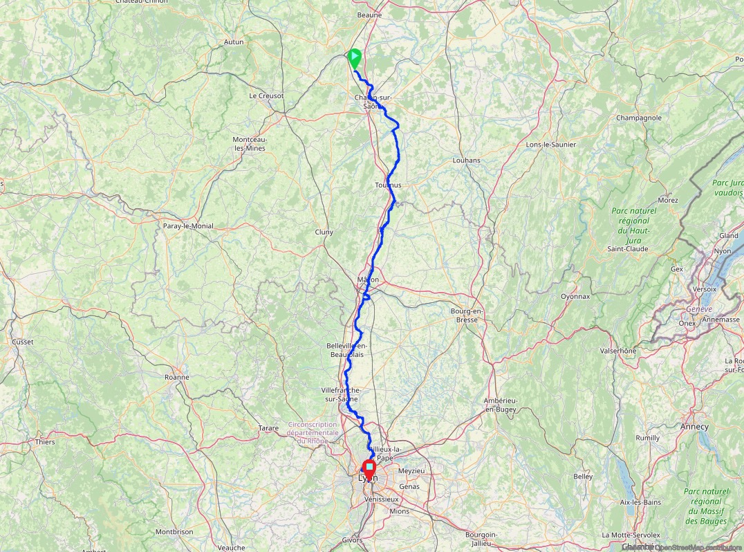 Na het debacle van gisteren heb ik de route van Benjaminse gelaten voor wat ze was en goede oude getrouwe brouter opgestart. Beginpunt, eindpunt en voila een mooie beschutte route langs de Saône. Soms is die software haast akelig telepathisch, hij kiest precies de route die ik zelf zou tekenen. Als ik Benjaminse had gevolgd was het weer heel de tijd departementals met auto’s rond de oren, zonder beschutting en met een klim over 600m.