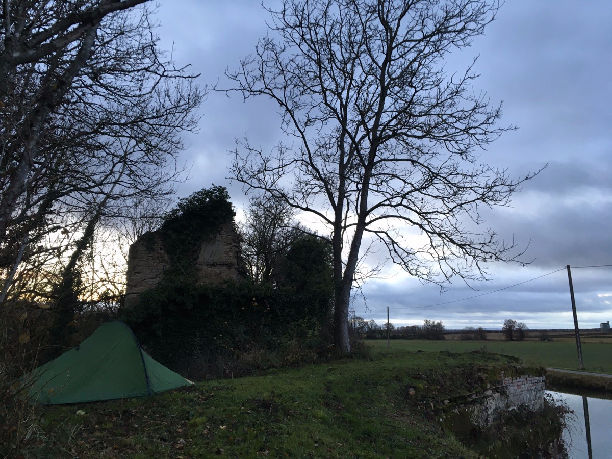Deze nacht wat regen gehad maar buiten modder in de tent geen problemen, gelukkig maar want ik stond nogal zichtbaar. Je mag in Frankrijk bivakkeren maar het is me niet duidelijk of dat ook op de oevers van de kanalen mag.