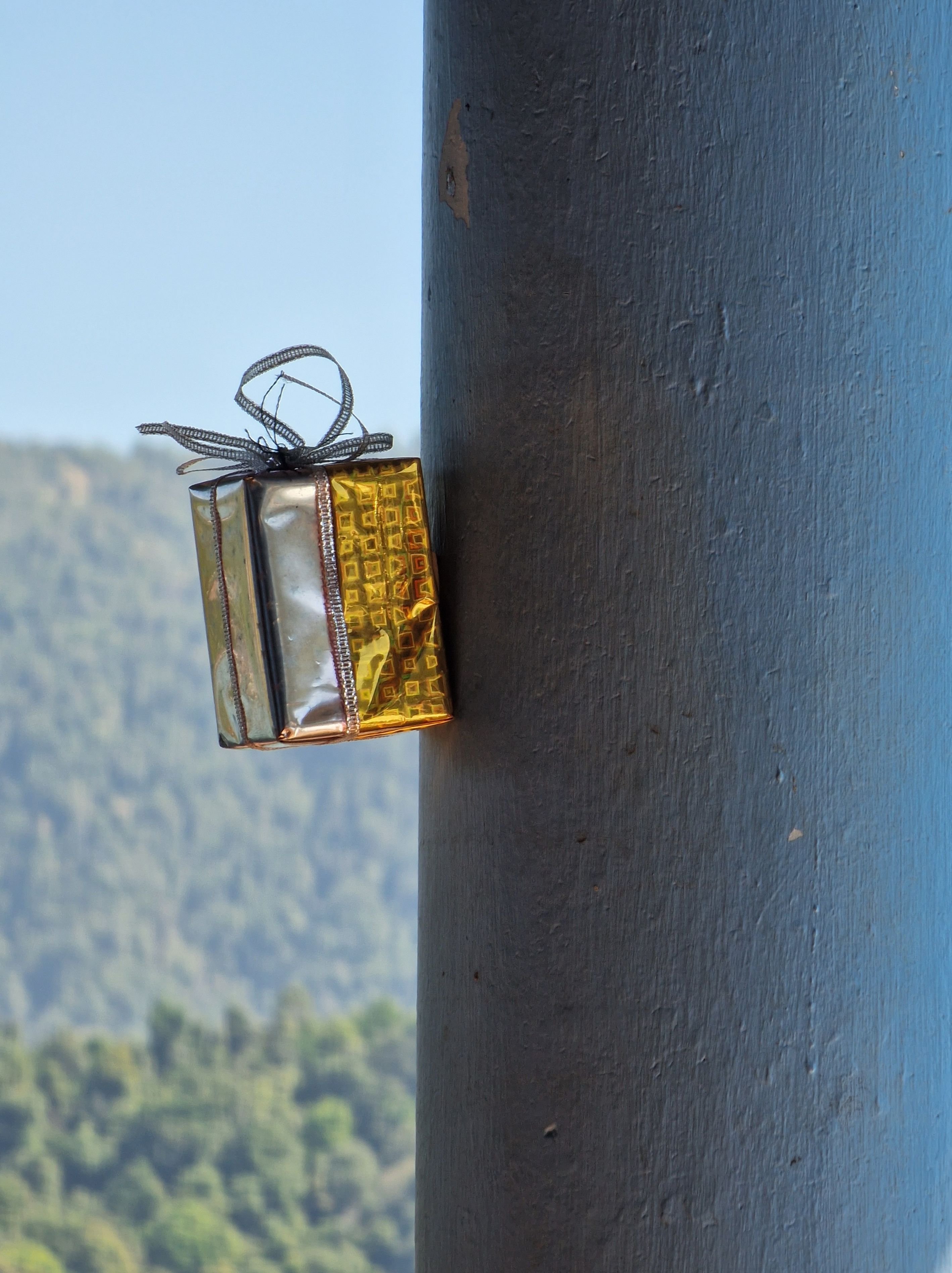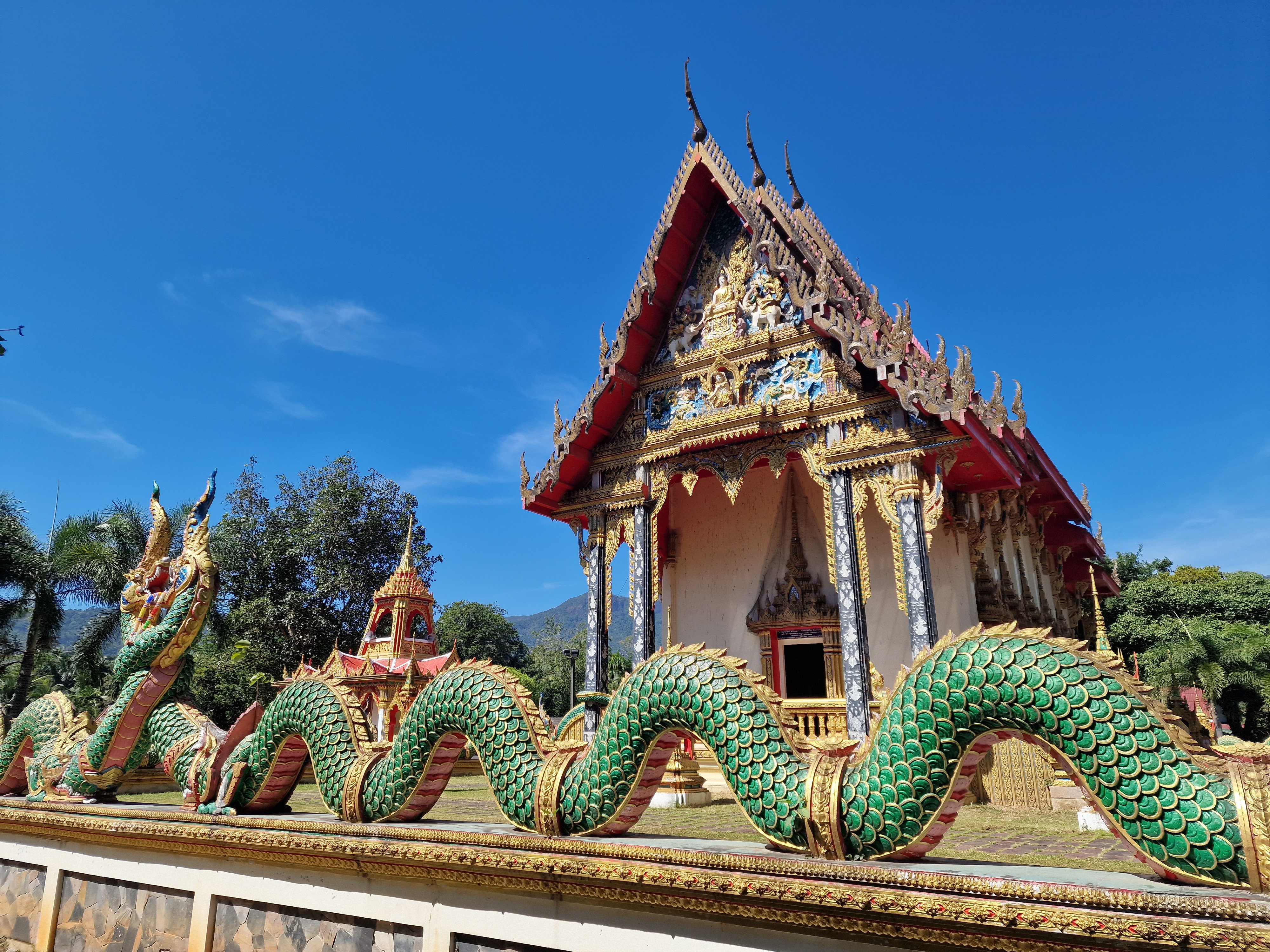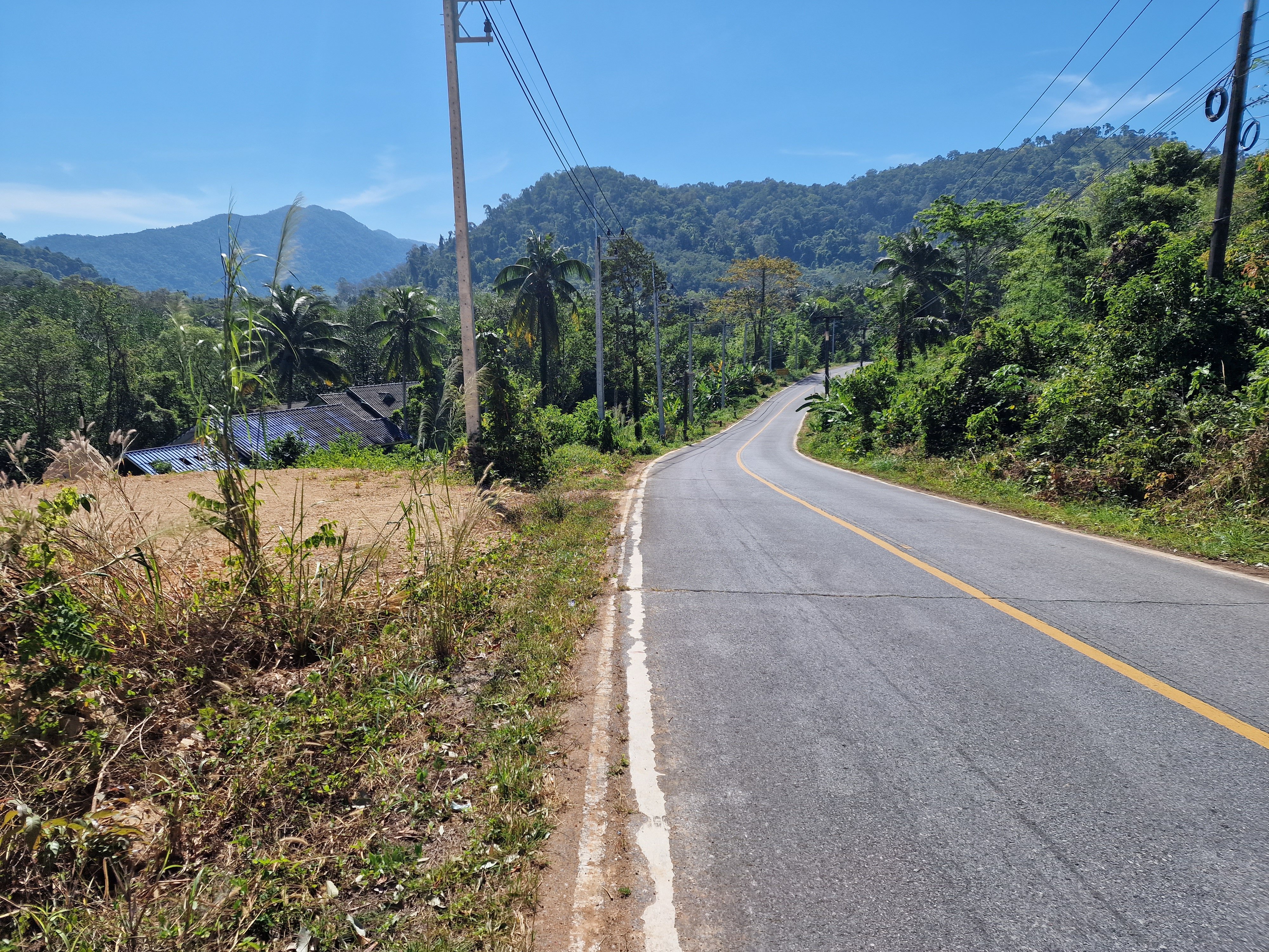 Het glooiende asfalt brengt me verder tot het vissersdorpje Salak Phet. Dat ligt in vogelvlucht amper 7 km van Bang Bao, waar ik daags tevoor naartoe fietste, maar beide dorpjes zijn niet via een weg verbonden. De kortste weg over het land tussen deze twee dorpjes is een meer-dan-driekwartcirkel rond het eiland en dat is 49 kilometer. Salak Phet telt heel wat paalwoningen die met hun hoge betonnen poten in de rustige baai staan. Via veel haakse bochten leidt een smal betonnen paadje me tussen de huisjes naar The Fisherman’s hut. In dit kleine restaurantje met prachtig uitzicht op de baai neem ik een lekkere lunch met frisdrank. De kerstversiering is zo lief en subtiel aangebracht dat ik er blij van word.