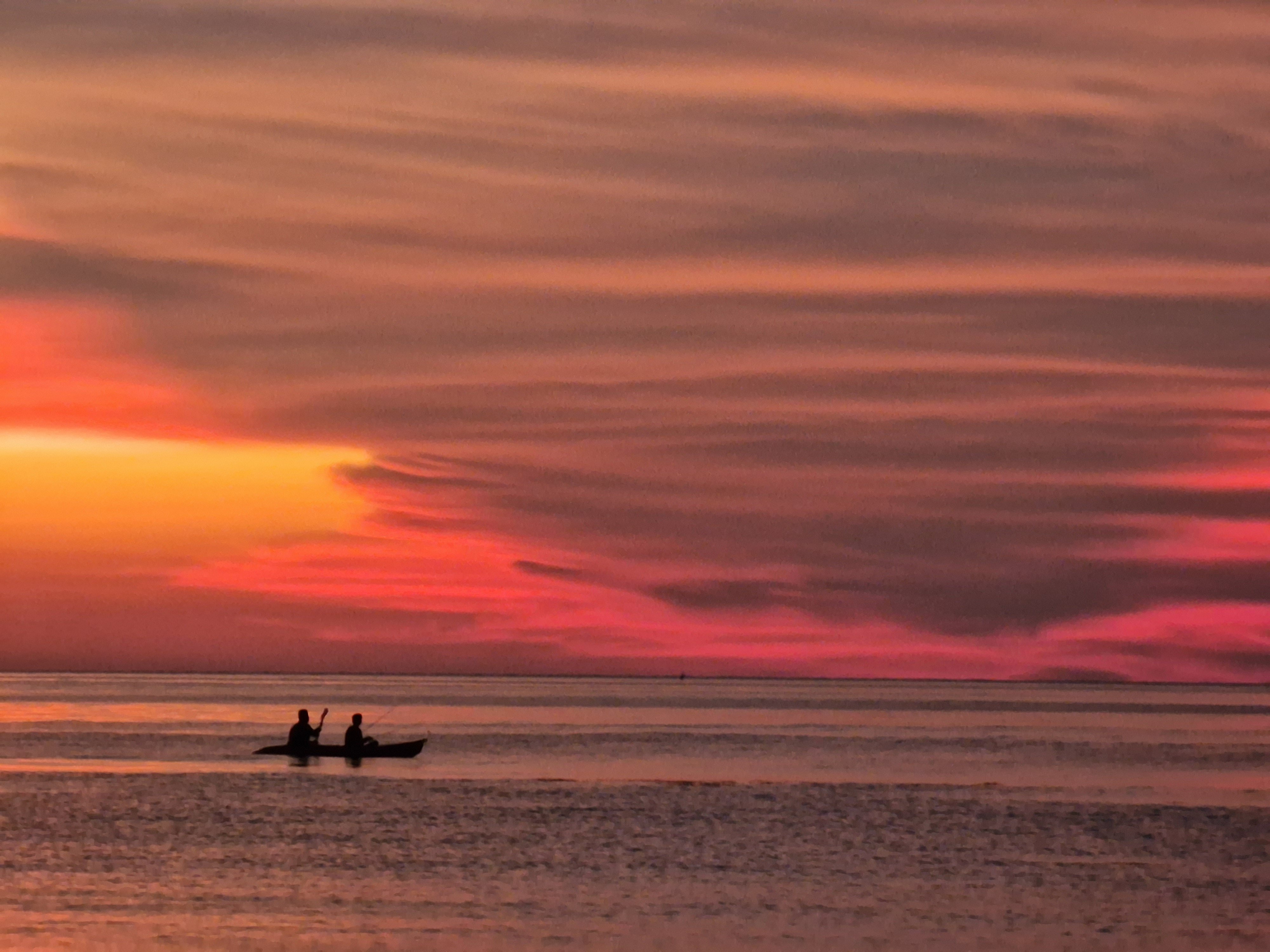 Ik haast me terug naar mijn resort want ik wil de zonsondergang op het strand niet missen. Die lijkt deze avond wat in het water te vallen (pun…). Een grote grillige blauwgrijze wolkenflard bedekt een groot deel van de hemel, maar de horizon lijkt wat helderder. Toch tracht ik enkele mooie foto’s te nemen en gebruik wat kayakkende toeristen en vissers als decoratie, maar het blijft een beetje een saaie soep. Ik besluit terug te keren en vlei me neer in een mooie rieten zetel in de tropische tuin van het resort.