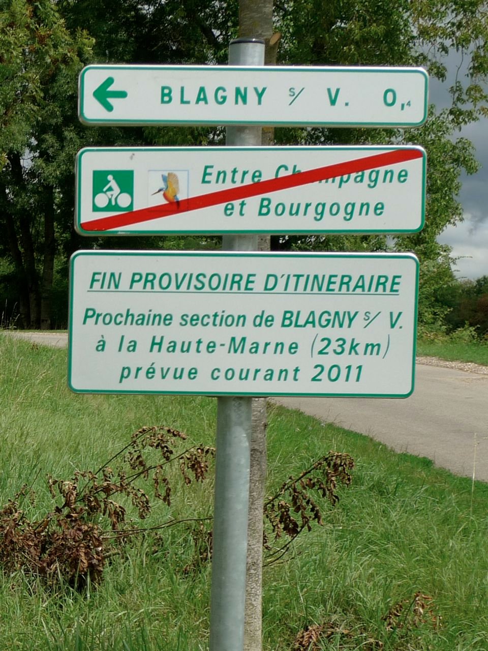 In 2011 stonden we weer eens aan de Bourgondische kant en ... er bleek een stuk van het kanaal ingericht ... dus op hoop van zegen toch maar weer het kanaal. Kort na het Viaduc de Oisilly was er het fin provisoire ... maar tegelijk was er wel een ingericht jaagpad, en ook waren er steeds weer zwart afgeplakte bordjes en steeds ging het weer verder en verder, tot aan het Plateau van Langres ... wij waren wellicht de eerste fietsers die het nieuwe fietspad inaugureerden "avant la lettre", dwz voor de officiële lijntjesknipperij. (Dit was niet de eerste keer dat zoiets ons overkwam.)