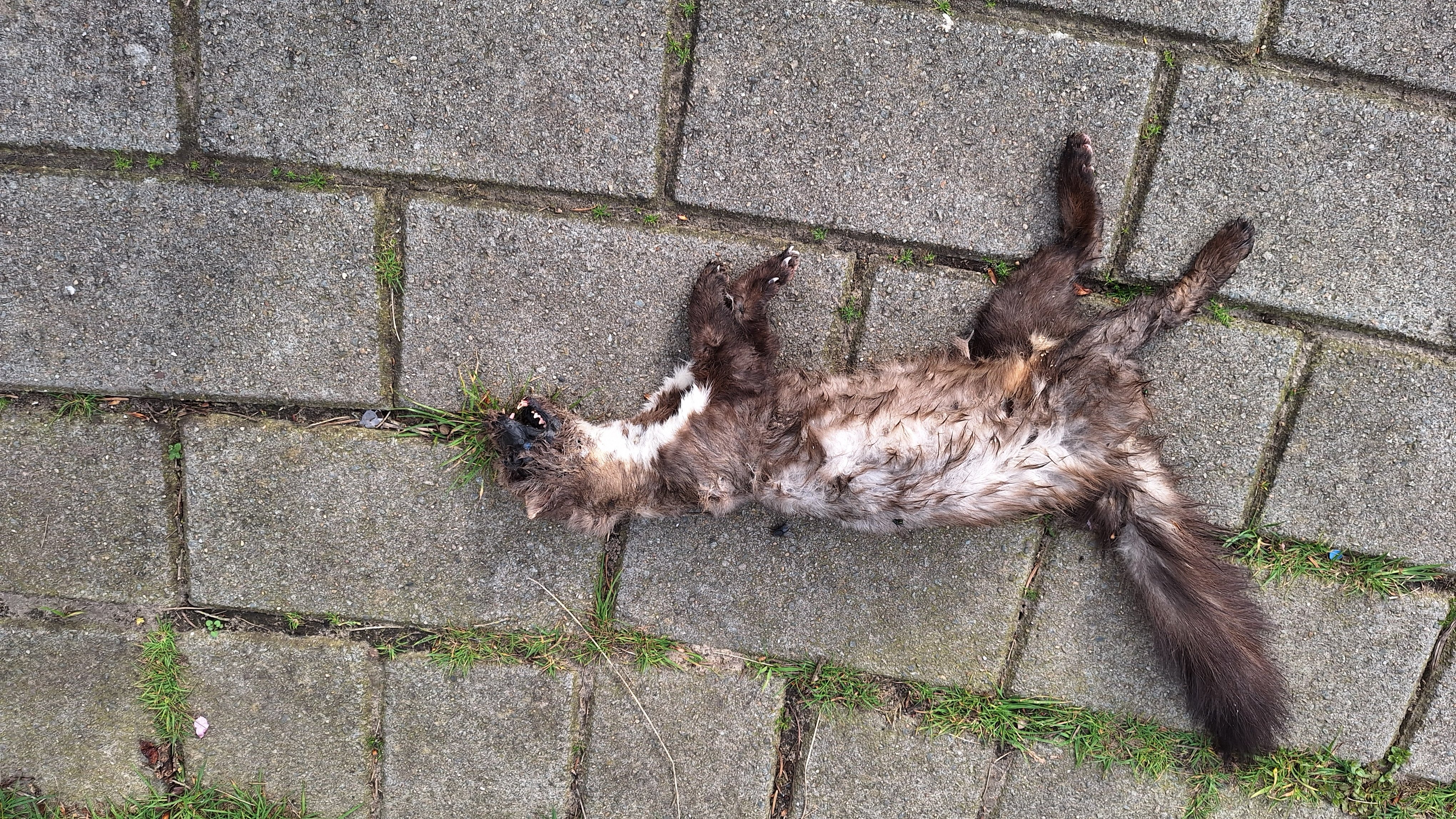 Dit hermelijntje had net niet de juiste route gekozen in het gebied waar Nederland, Vlaanderen en Wallonië elkaar ontmoeten op een plek waar de snelweg, het spoor, de Berwijn, de Maas met een stuw, het Albertkanaal, parkeerplaatsen, hoogspanningsleidingen en een industrieterrein samenkomen. Gemeld op waarneming.be.