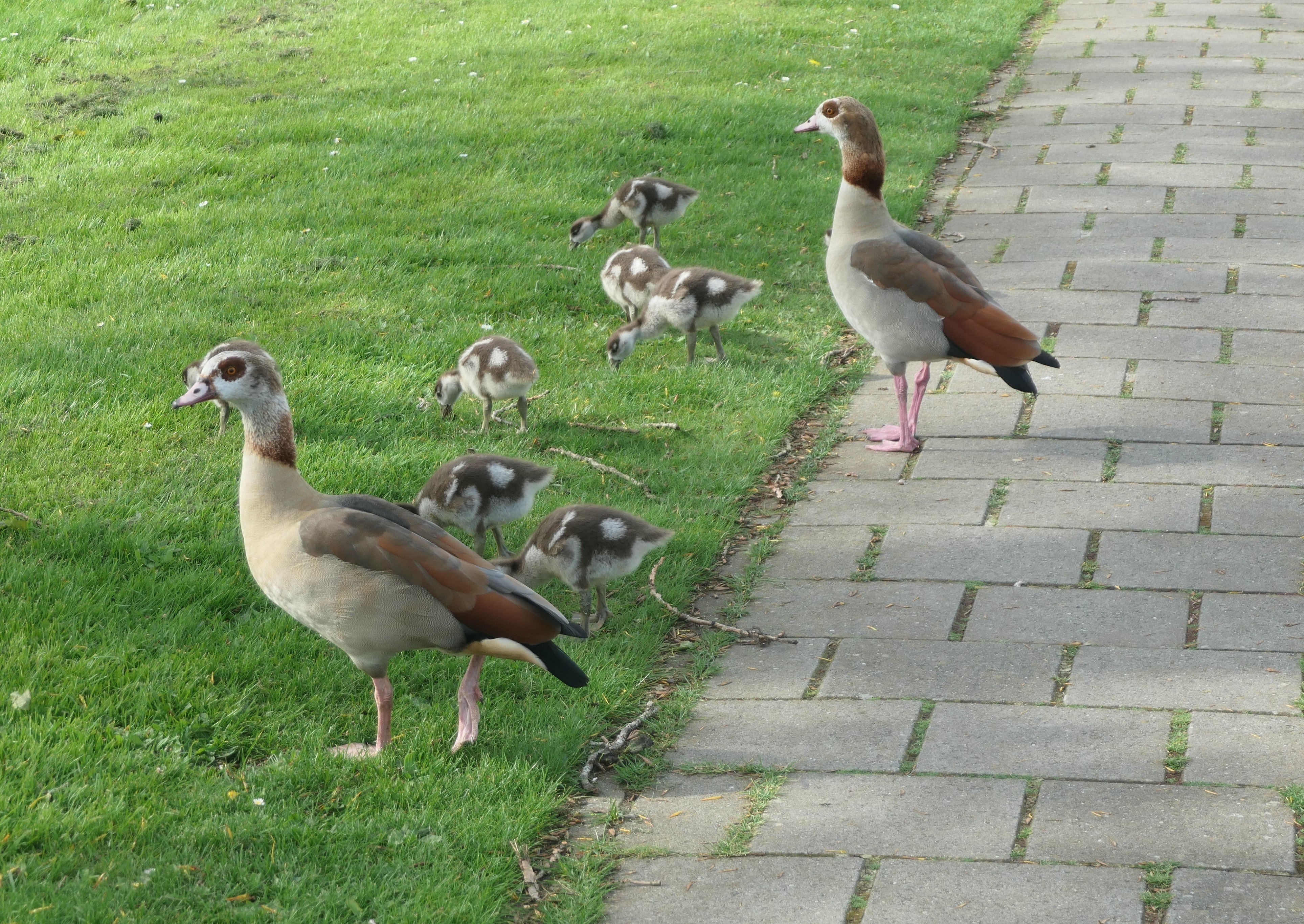 Dit zijn Nijlganzen. Nog een jaar of 10 geleden zijn die exoten onbekend, kwamen niet in vogelboeken voor. Nu zeer algemeen. Ook al asielzoekers onder de vogels....