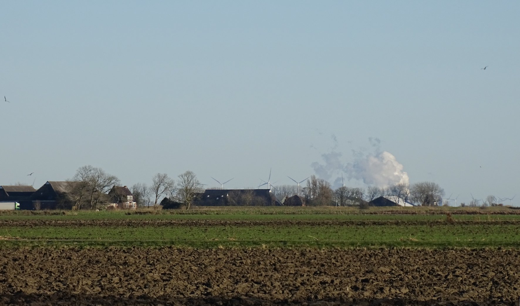 Vanuit mijn huis gefotografeerd: de windturbines staan op de Eemshaven, de kade van de veerboot bevindt zich ver achter de middelste boerderij.